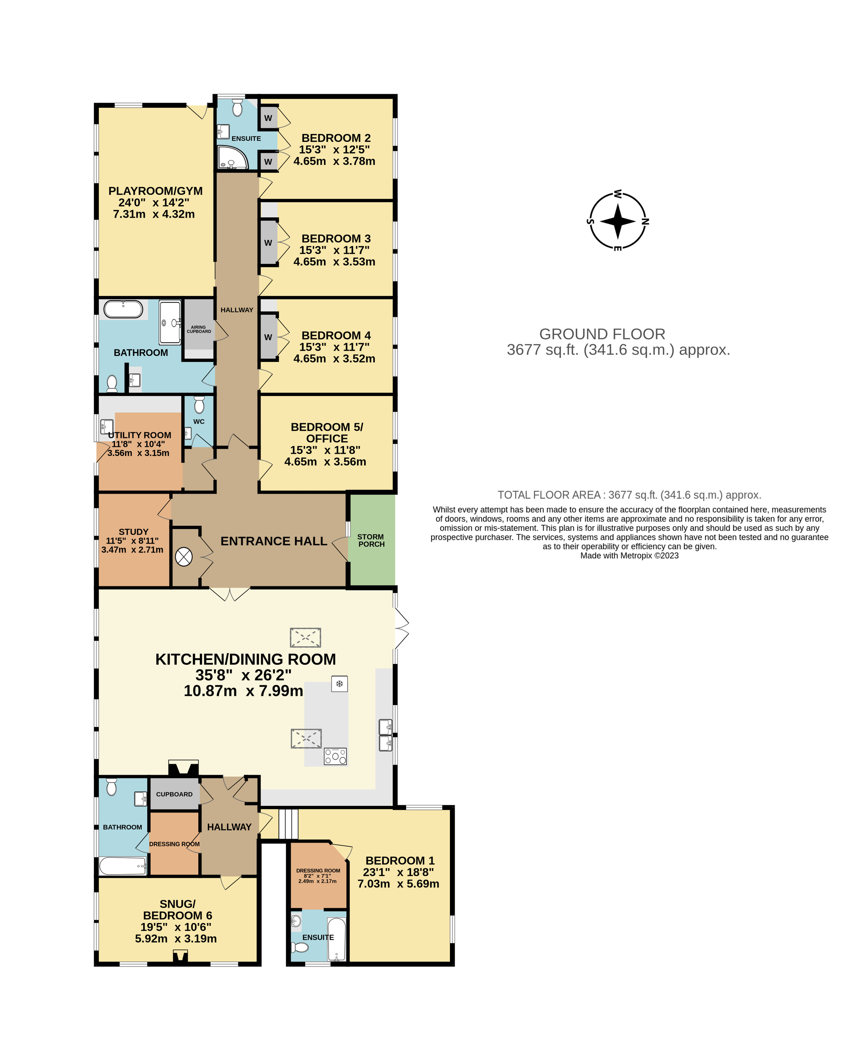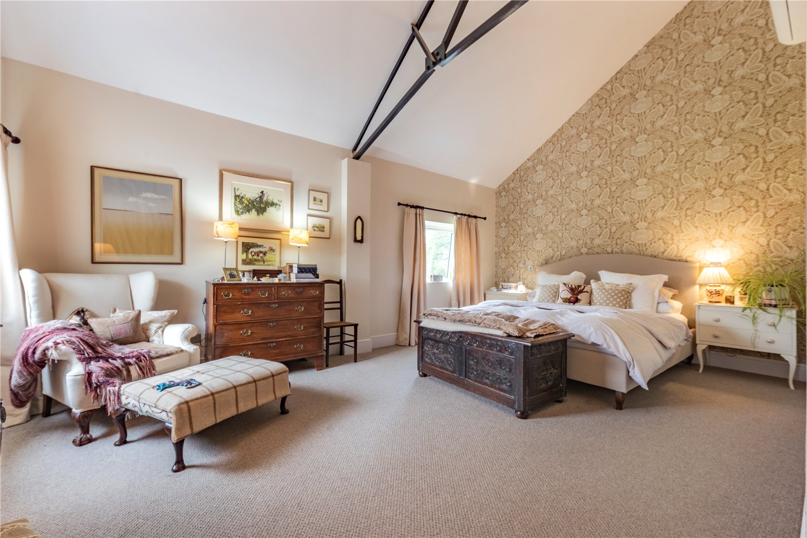 Beneath a storm porch the front door opens into a generous entrance hallway with storage and plant room, study, well-equipped utility/boot room and cloakroom. Four double bedrooms are served by a superb family bathroom and ensuite shower room. Great flexibility is provided by another large room currently utilised as a playroom and gym.