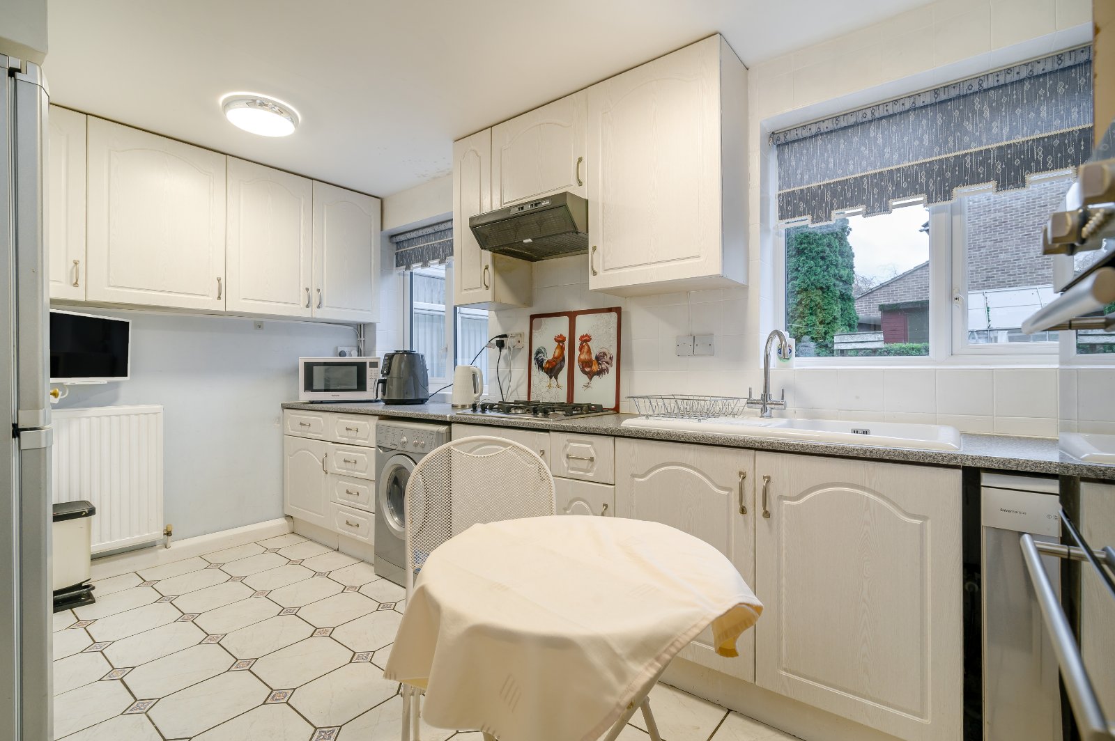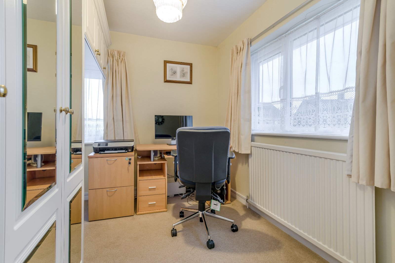 Upstairs, a generous and light-filled landing offers enough space to accommodate a desk, creating a perfect study area. The principal bedroom includes built-in wardrobes, while the second bedroom benefits from eaves storage and the third, built-in furniture. All are served by a family bathroom of modern three-piece white suite with a separate shower.