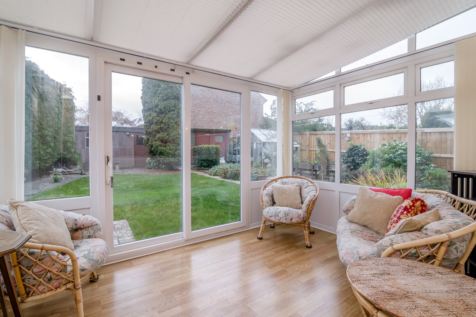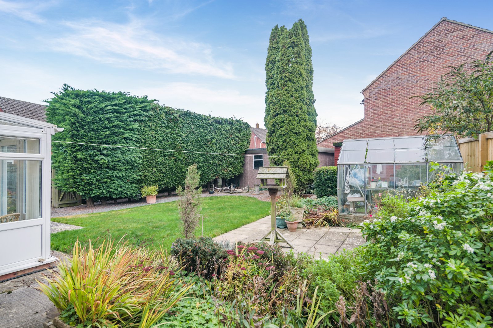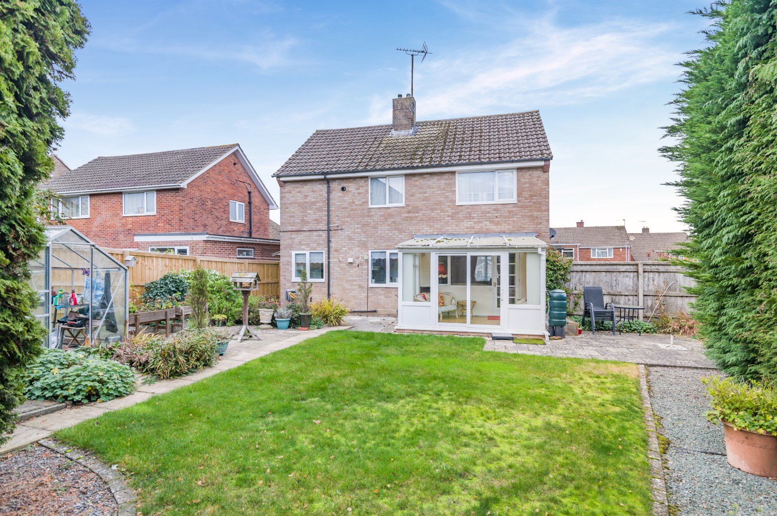 Enjoying a southerly facing rear garden, this private sheltered outside space is ideal, whether relaxing, entertaining or for play. Set around a central lawn, well-stocked borders surround patios, a timber shed gives useful storage and a greenhouse is included.
