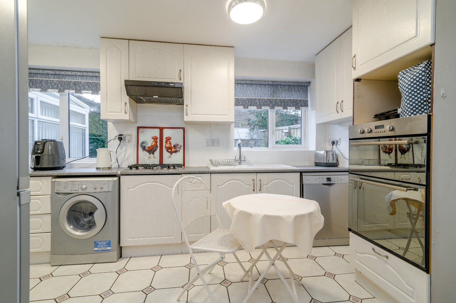 A useful entrance porch opens into a hallway with attractive parquet flooring. The large dual-aspect sitting room features a charming bay window and an electric fire, creating a bright and comfortable living space. A separate dining room provides an ideal setting for family meals or entertaining, while the fitted kitchen offers space for casual dining and includes an integrated oven and hob, freestanding washing machine, dishwasher and a useful larder. To the rear, a spacious conservatory overlooks the garden and provides an additional versatile living area. A convenient cloakroom completes the ground floor.