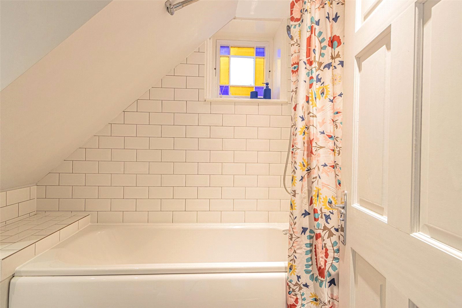 Upstairs, the property features a large landing area with an impressive feature window that allows natural light to flood the space. The first floor includes a great-sized double bedroom with high ceilings and a beautifully designed bathroom, complete with a stained glass window that adds to the charm. A set of stairs leads to the top floor, where youll find an impressive bedroom loft room, featuring original beams and Velux-style windows that create a light and airy feel.