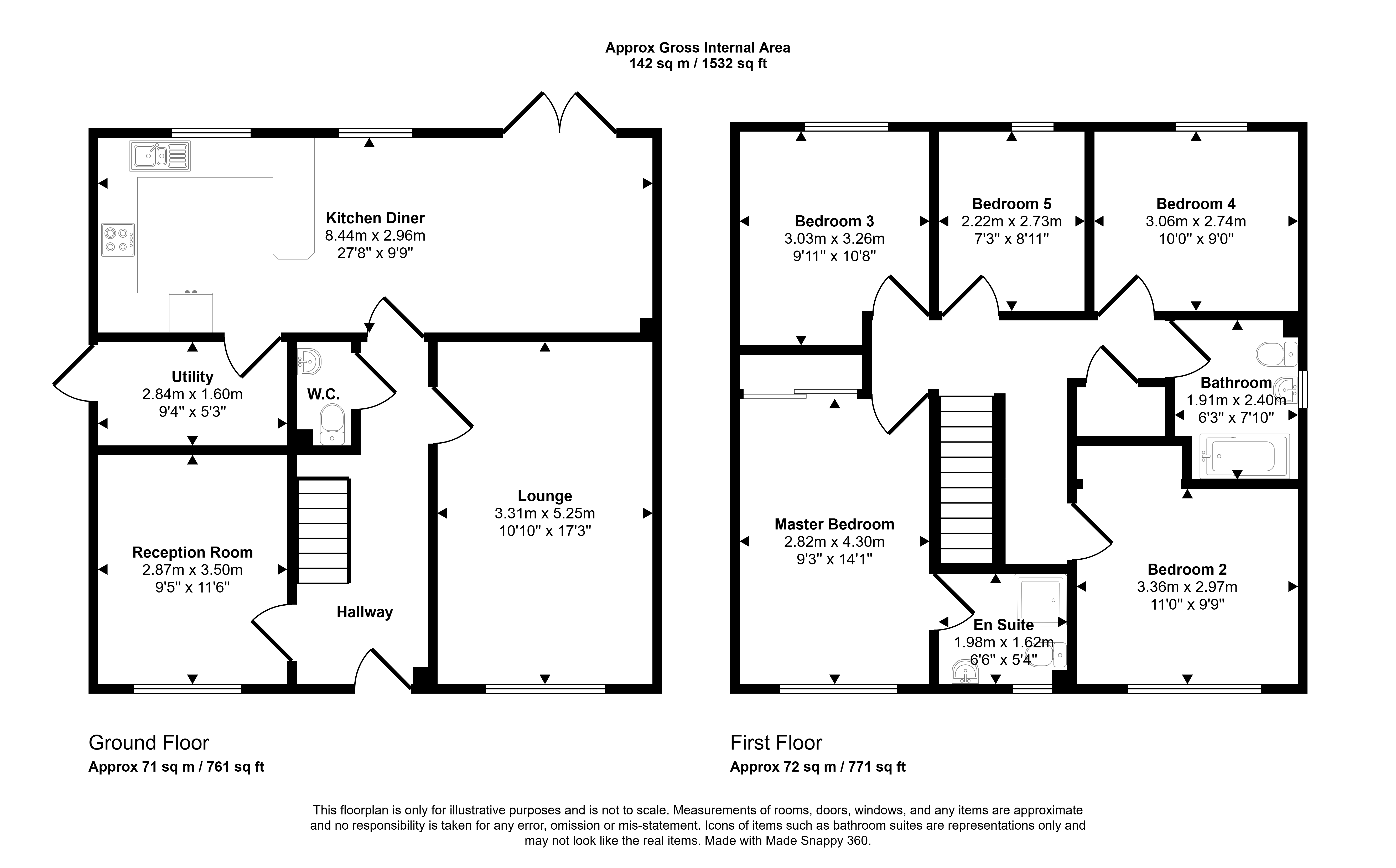 To the first floor, the property offers five well-proportioned bedrooms. The principal bedroom benefits from a contemporary en suite shower room, while the remaining bedrooms are served by a modern family bathroom. The generous bedroom sizes make this an ideal home for larger families, guest accommodation, or those requiring additional workspace.
