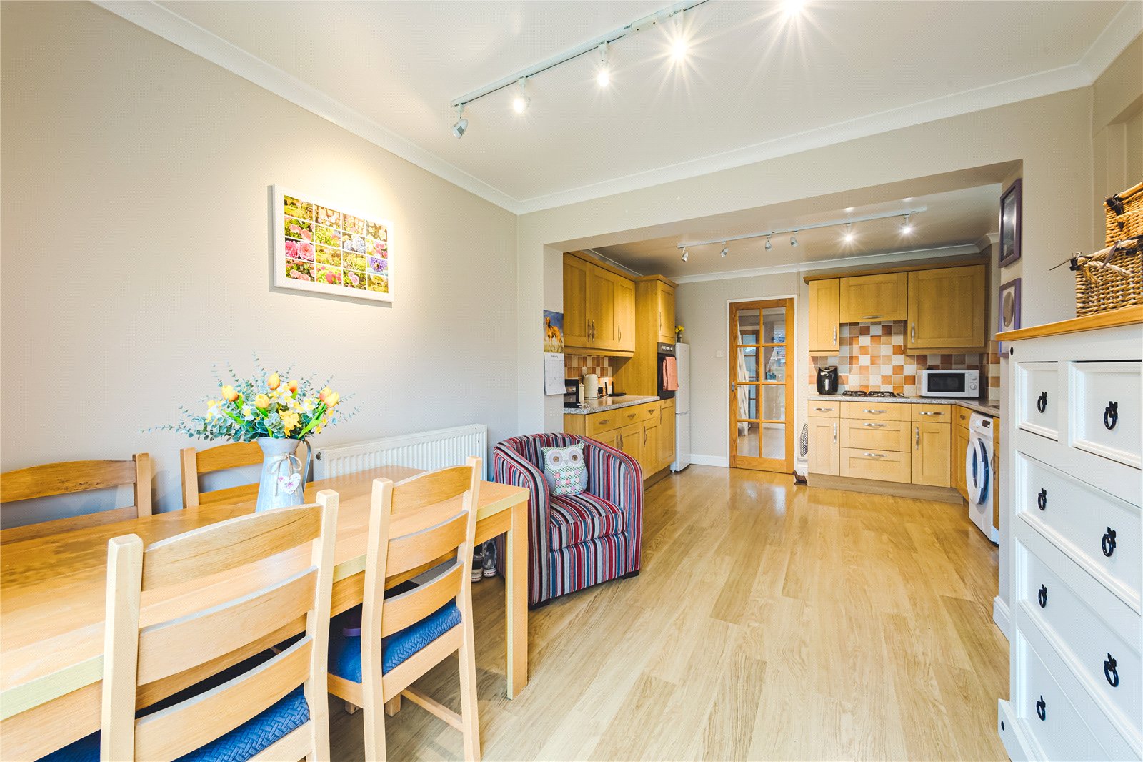 The property has been thoughtfully extended to the rear on the ground floor, creating a generous living space with excellent natural light and direct access to the garden. The accommodation briefly comprises an entrance hall, a bright and spacious reception room, and an extended kitchen/dining area overlooking the rear garden.