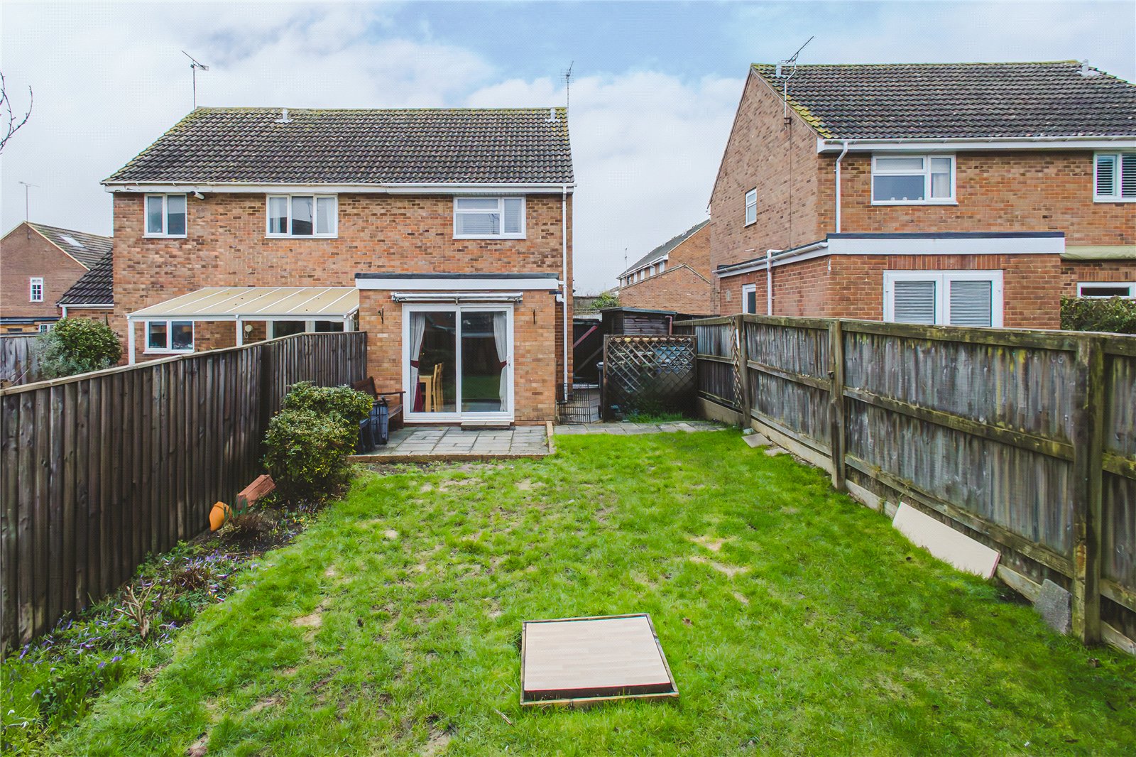 Externally, the property benefits from a large rear garden featuring a patio area ideal for outdoor dining and entertaining, alongside a well-maintained lawn. There is useful side space with a shed and gated rear access. To the front, a small lawn area complements driveway parking for two vehicles.
