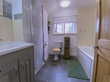 Bathroom - 2.13m x 2.34m (7' x 7'8) - Fitted with a three piece suite comprising, low level wc, bath with shower over and vanity unit with mounted basin.