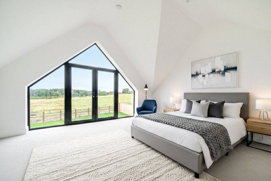 Noir by David Cliff Contemporary Living, Country SettingA striking new four/five-bedroom home of exceptional quality, set on the edge of Bramley village with uninterrupted views over open paddocks, and offered with an additional acre of garden, creating a substantially larger outdoor space to enjoy.Built by a respected local developer, this residence offers approx. 2,666 sq. ft. of elegant living plus a detached double garage. Behind five-bar gates, the home makes a bold first impression with its contemporary design and oversized front door, opening into a light-filled reception hall.The heart of the home is a magnificent open-plan kitchen, dining, and family room, triple aspect and flooded with natural light, with glazed doors to the gardens. The kitchen features a central island, stone worktops, and premium integrated appliances. A utility room, dual-aspect living room with wood-burning stove, and a versatile study/flexible room complete the ground floor ideal as a home office or a comfortable fifth bedroom if required.Upstairs, a galleried landing leads to four spacious doubles. The luxurious principal suite enjoys dual aspects, a dressing room, and en suite shower. The family bathroom features a freestanding bath, walk-in shower, and stylish fittings.Outside, the property benefits from a private driveway, detached double garage, and beautifully landscaped gardens. The grounds now extend to include an extra acre of garden, creating a wonderfully generous setting with a terrace and lawn that flow seamlessly into open countryside and paddocks beyond.Bramley combines rural charm with excellent connections, offering shops, a bakery, pub, and a station with direct trains to Reading, Basingstoke, and London.ServicesAir source heat pump with underfloor heatingMains electricity & waterBiodisc septic tankLocal Authority: Basingstoke & DeaneEPC: B | Council Tax: TBC
