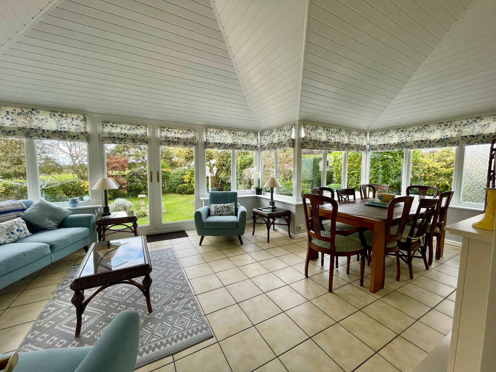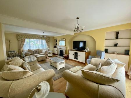 Wrap around windows with doors to side into garden, slate roof, feature electric fire, tiled flooring.