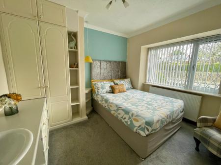 Window to front, window to rear with sea view, coved ceiling, two built-in wardrobes, built-in storage units above bed and bedside cabinets, built-in dressing table, ceiling fan, 2 radiators, carpet.