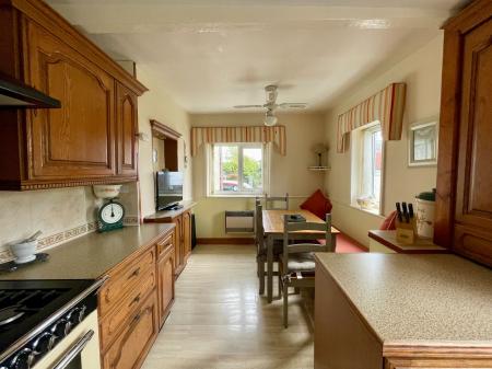 Two windows to rear with garden and sea view, one window to side, door to rear, fully fitted kitchen with six wall units, one larder unit, 16 base units under granite effect work tops, dresser unit with two glass fronted doors, space for range cooker, composite sink and drainer, dining area with in-built seating area, gas flue heater, ceiling fan, tiled flooring.