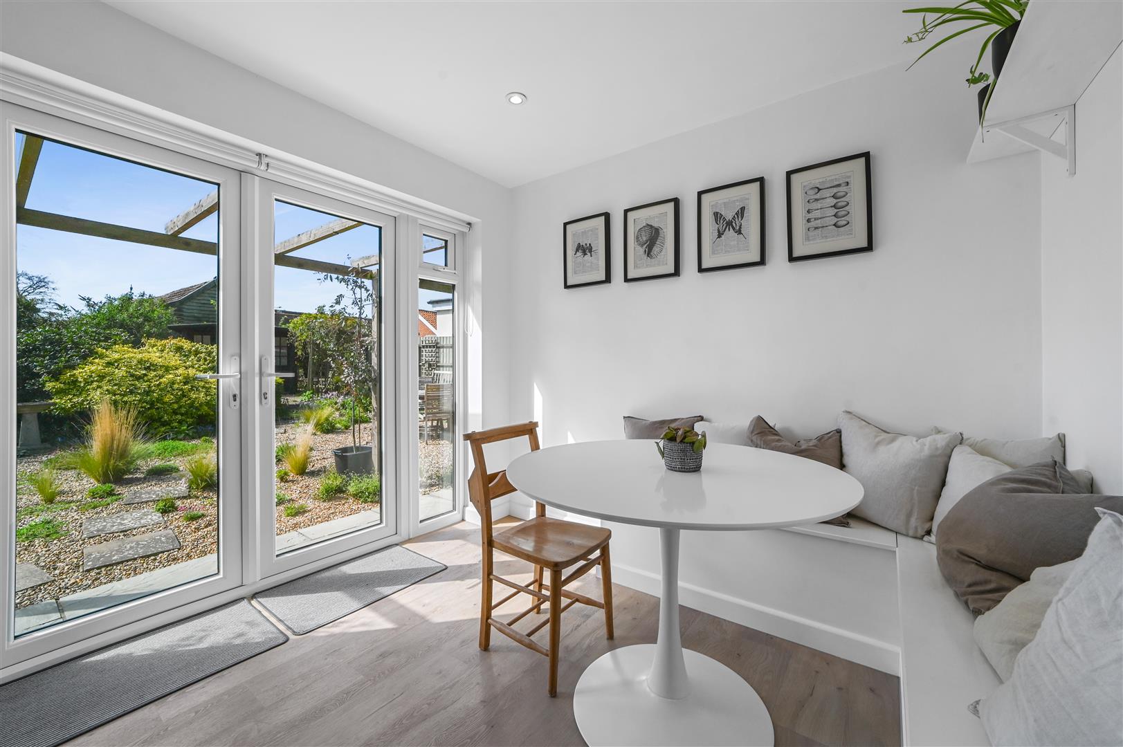 The welcoming entrance porch, bathed in natural light, leads into a spacious hallway that connects the heart of the home. The inviting living room boasts sliding doors opening directly onto the rear garden, perfect for indoor-outdoor entertaining and family relaxation. The modern kitchen-dining room is fitted with integrated appliances and striking quartz worktops, with double doors leading to the garden an ideal spot for al fresco dining.