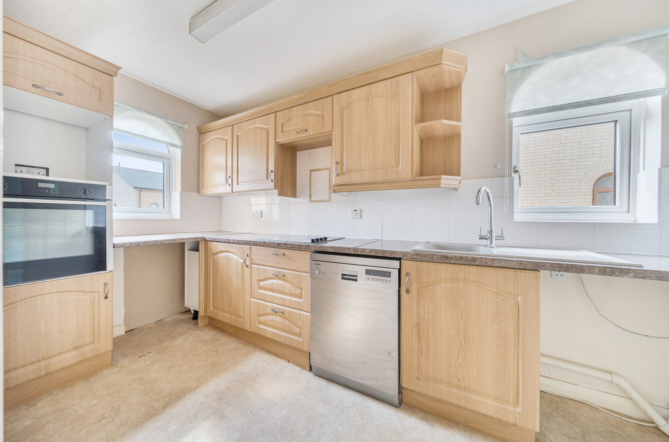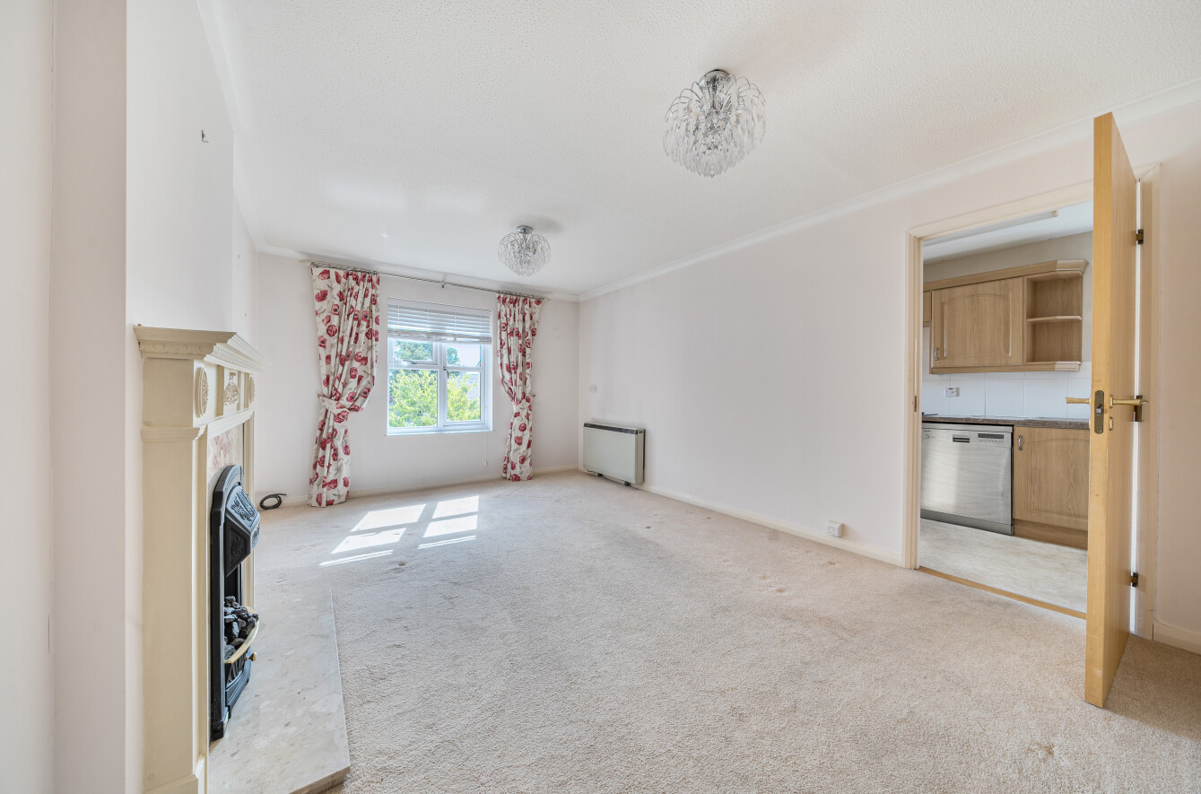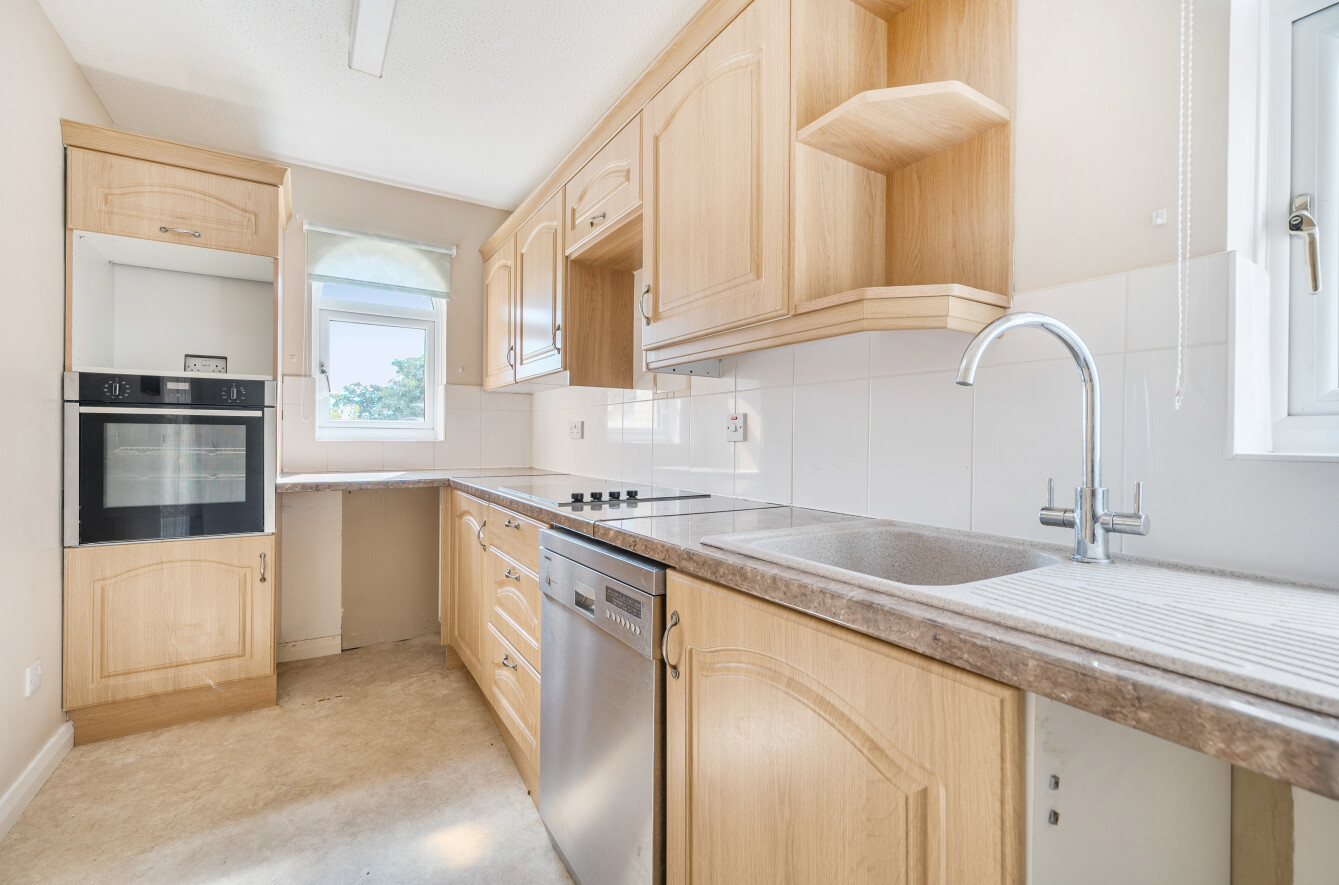 A communal front door opens to the entrance hall, with a staircase rising to the first-floor landing. From here, a solid wooden front door leads into the hallway, which provides loft access, a door-entry intercom system, a cloaks cupboard, and an airing cupboard housing a hot water cylinder with shelving. The open-plan lounge/dining room is light and airy, featuring a fireplace with an electric fire and views over the attractive communal gardens. From the lounge, there is access to a modern fitted kitchen comprising a range of wall and base units, roll-edge work surfaces ideal for food preparation, and an inset Asterite sink with tiled splashbacks. Appliances include an inset electric hob, a built-in eye-level electric oven, and plumbing/space for an automatic washing machine, with additional under-counter space for a fridge. This dual-aspect room benefits from abundant natural light, a ceiling-mounted strip light, and vinyl flooring.