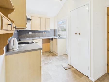 KITCHEN 13’9” x 8’1” Inset single drainer sink unit with cupboards under. Rolled top working surfaces with further cupboards & drawers under, matching wall cupboards over. Door to outside.