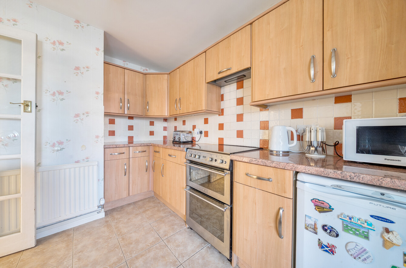 There are two bedrooms: a generous double bedroom and a good-sized single, ideal as a guest room or home office. The family bathroom comprises a panelled bath with wall-mounted electric shower, pedestal wash basin, and low-level WC .Part tiled walls, extractor fan, and an opaque double glazed window.