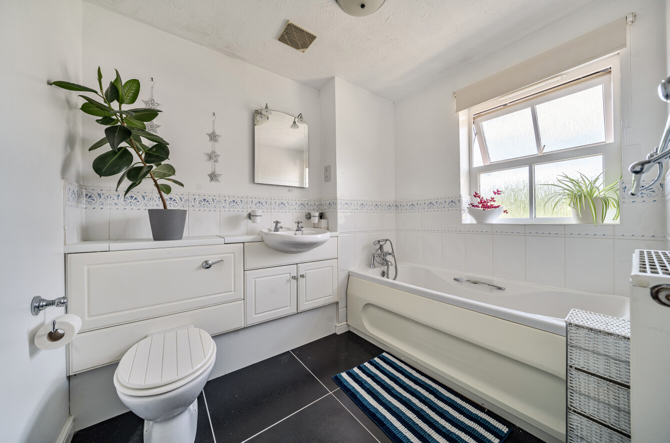 On the first floor a galleried landing with loft access and airing cupboard leads to four bedroomsthree doubles and a generous single. The master bedroom overlooks the rear garden and includes a built-in wardrobe and en-suite with bath, separate shower, vanity unit, WC, and tiled finishes. The family bathroom comprises a bath, glazed shower cubicle with wall mounted shower, vanity unit, WC, extractor fan, splashback tiling and tiled floor.