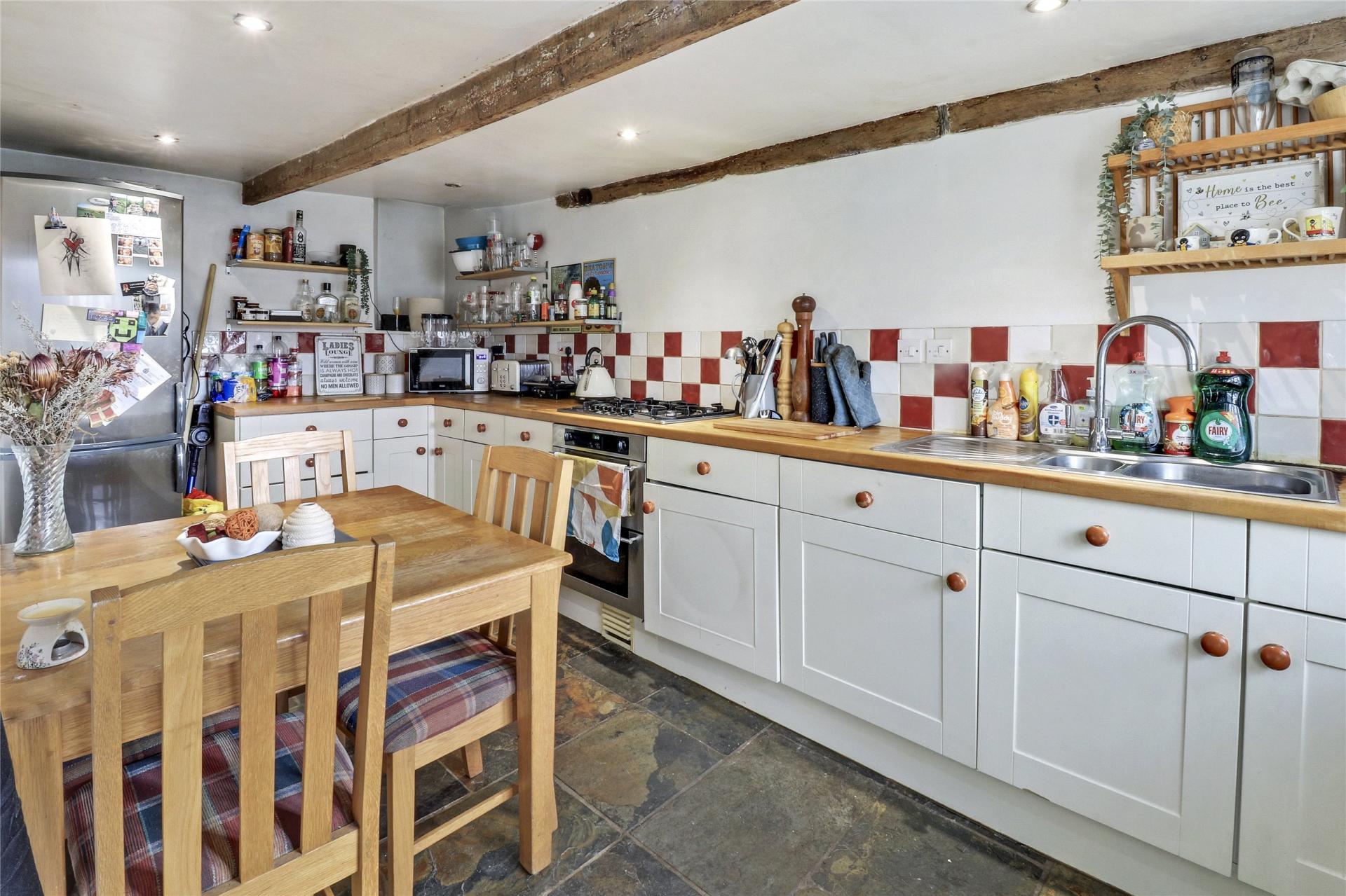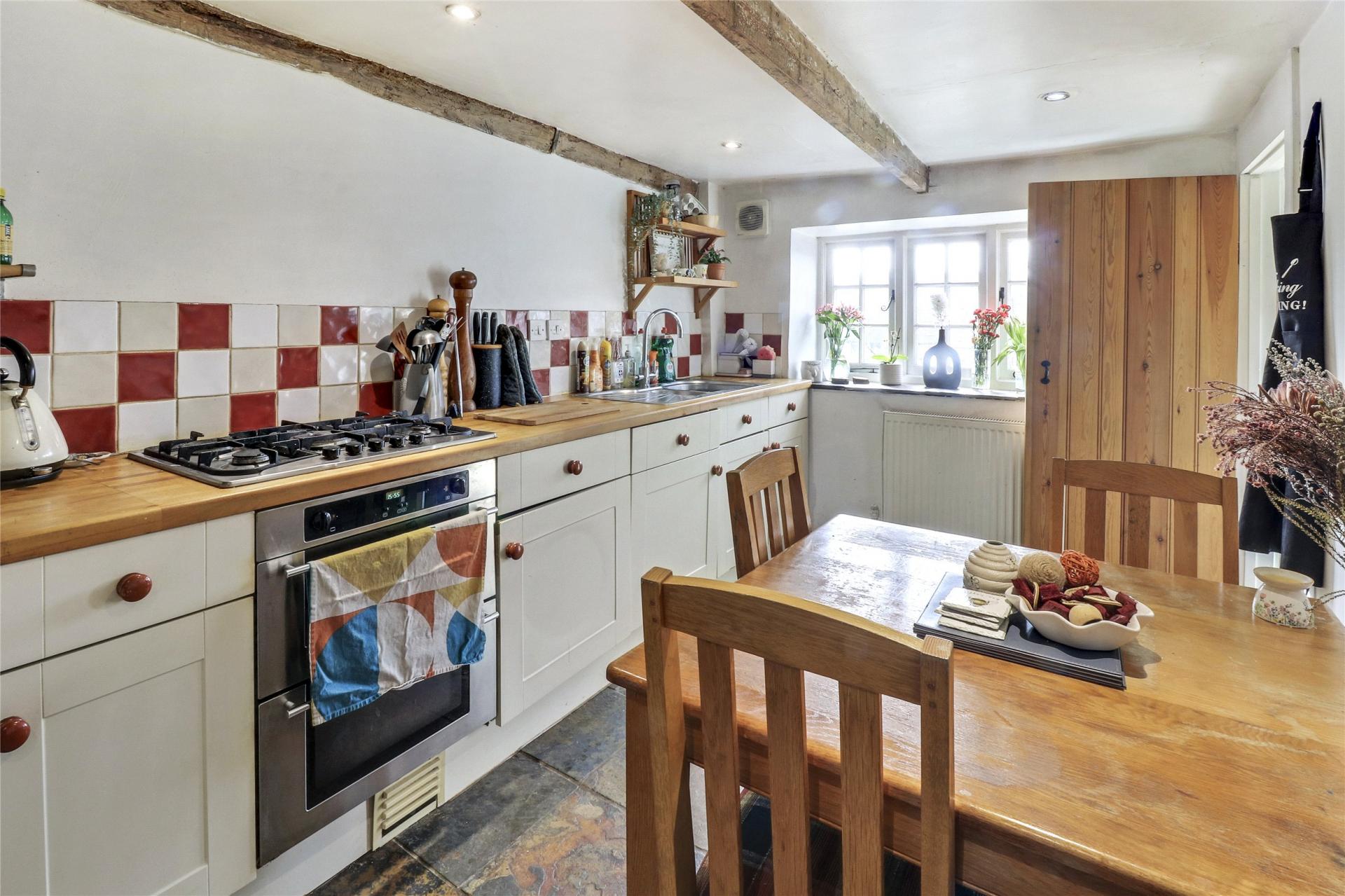 The hall gives access to a south facing sitting room with log burner and a charming kitchen/dining room, both with windows overlooking gardens and the village beyond.