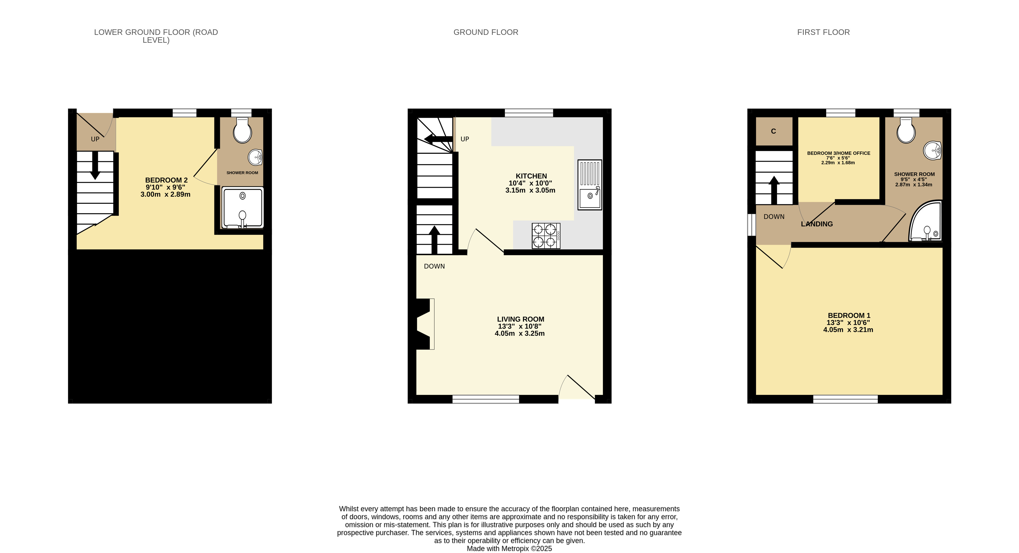 At the garden level, there is a living room with log burner and kitchen. At lower ground floor/road level, there is a second bedroom and WC/shower. On the top floor, there is a main bedroom, shower room and small third nursery/home office.