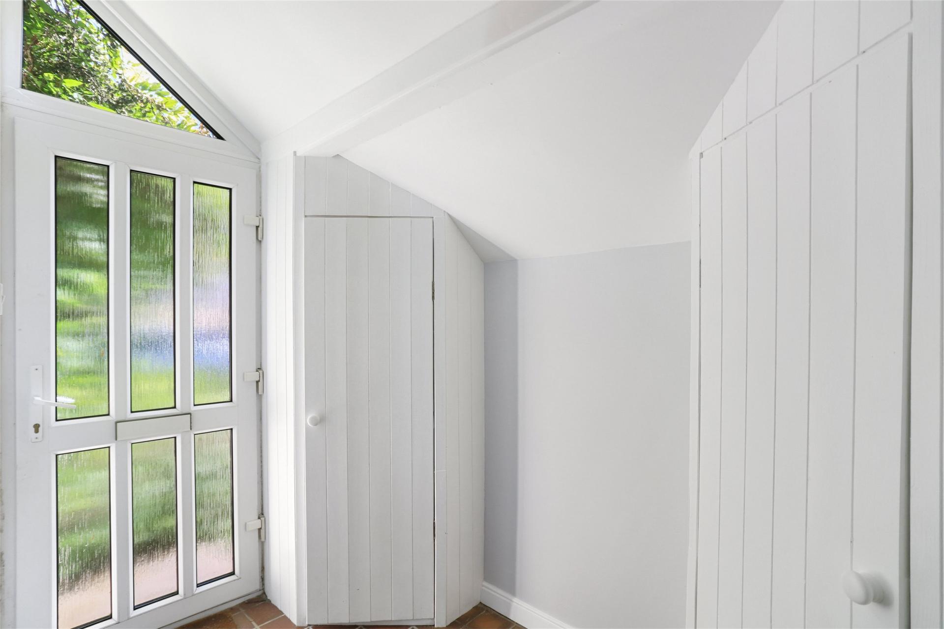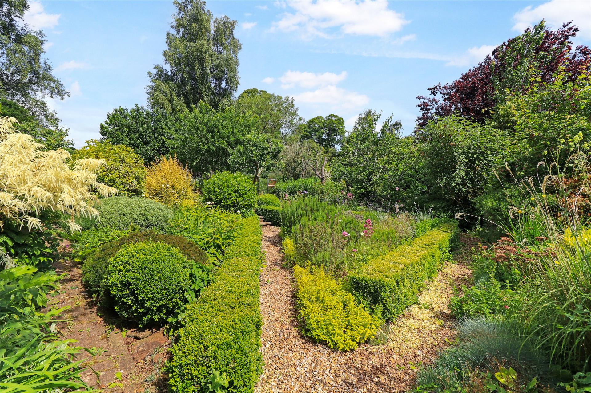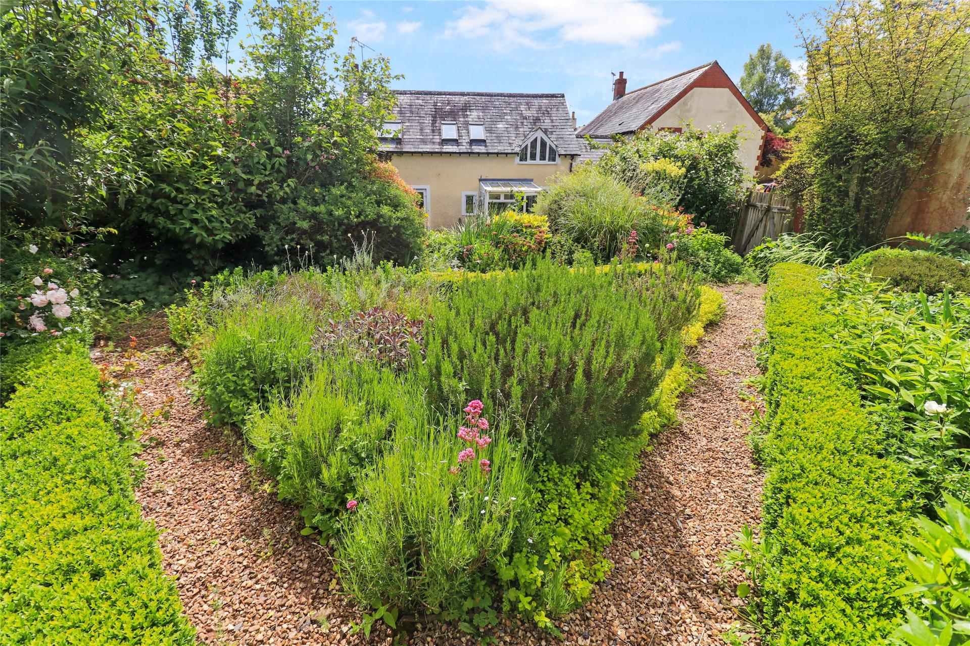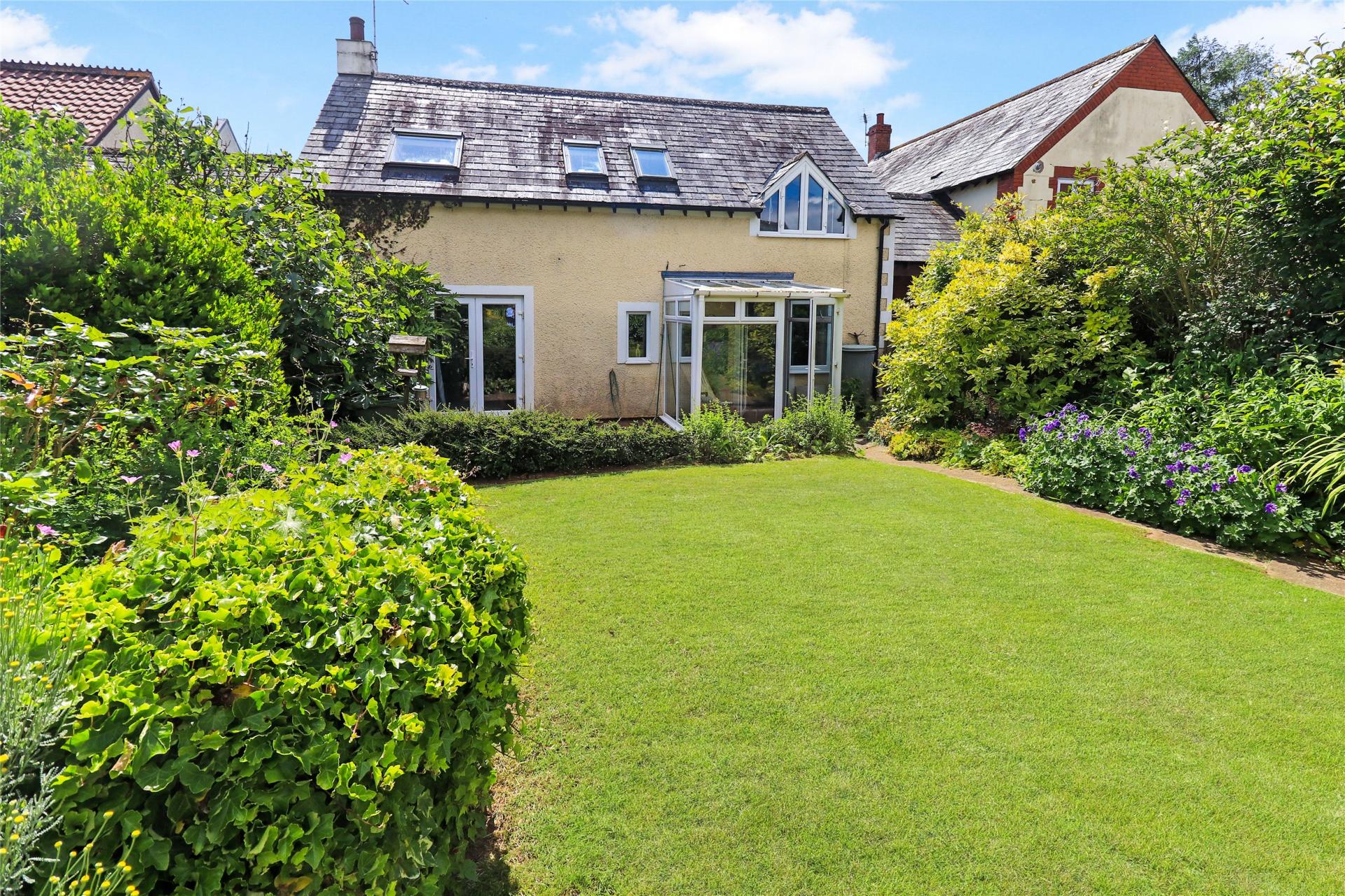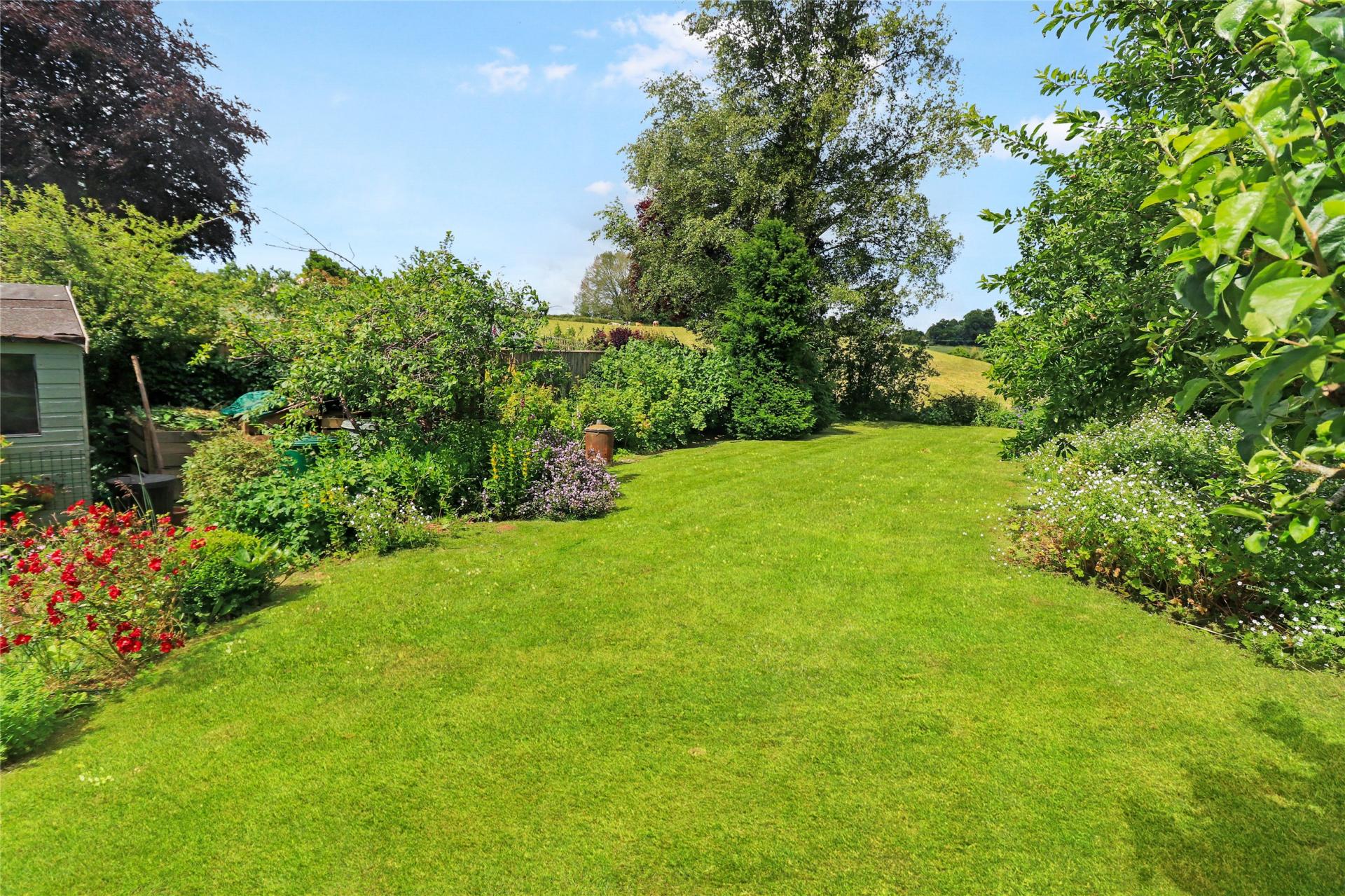 There is side pedestrian access to the rear garden which extends in excess of 100 feet to fields behind with terrace, flower bed gardens and large lawned area. There is a single garage with a parking space in front.