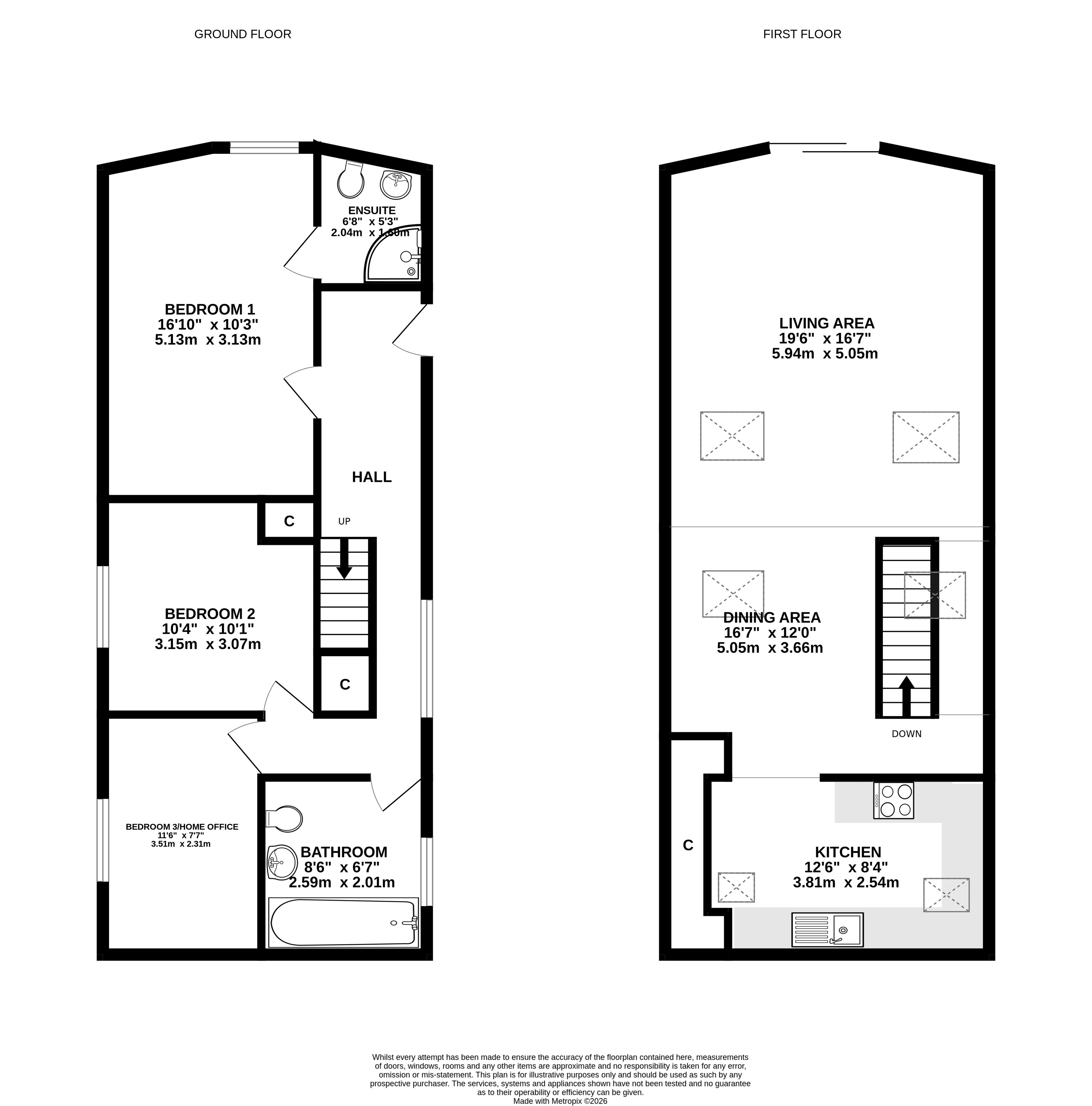Living Area 19'6" x 16'7" (5.94m x 5.05m).