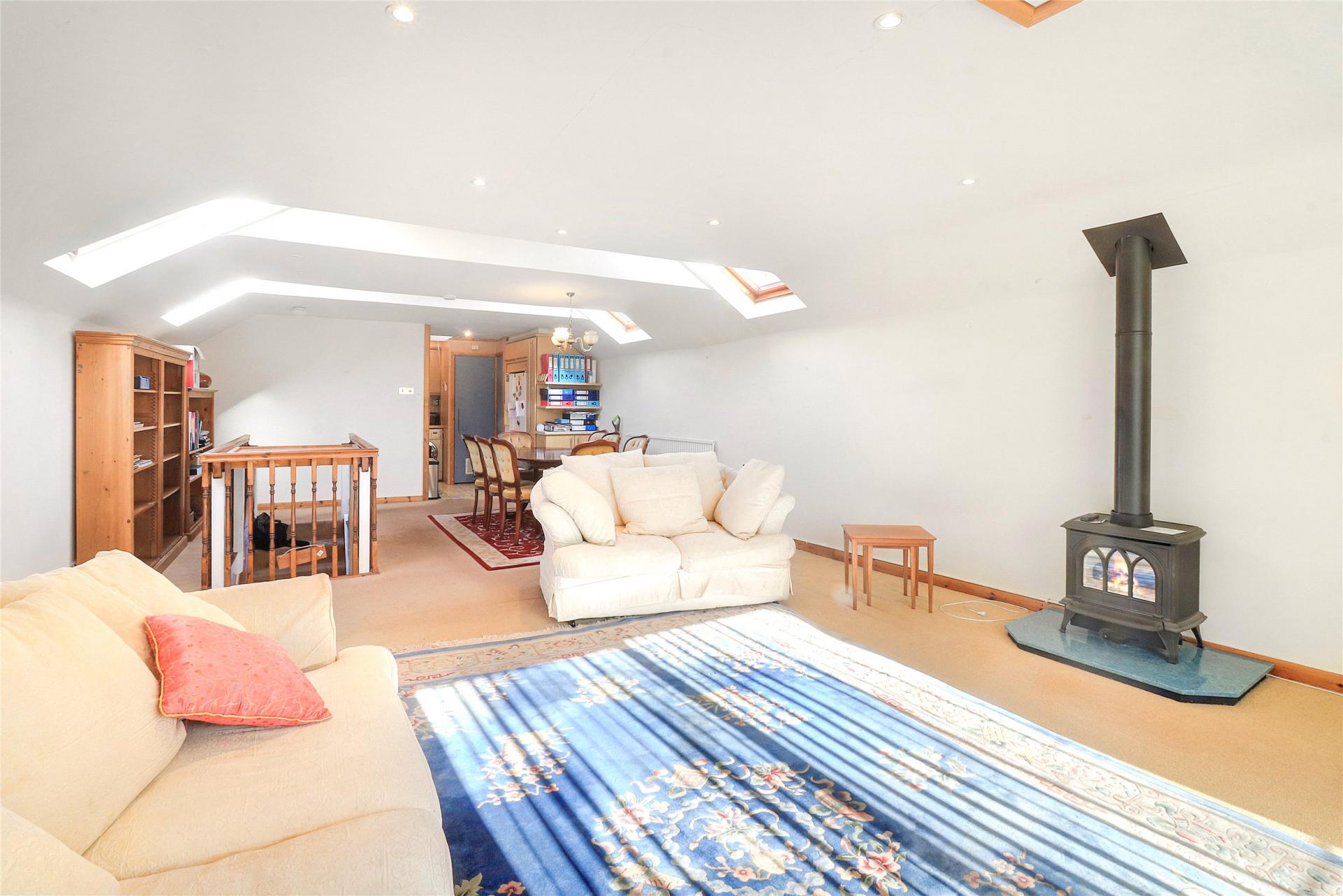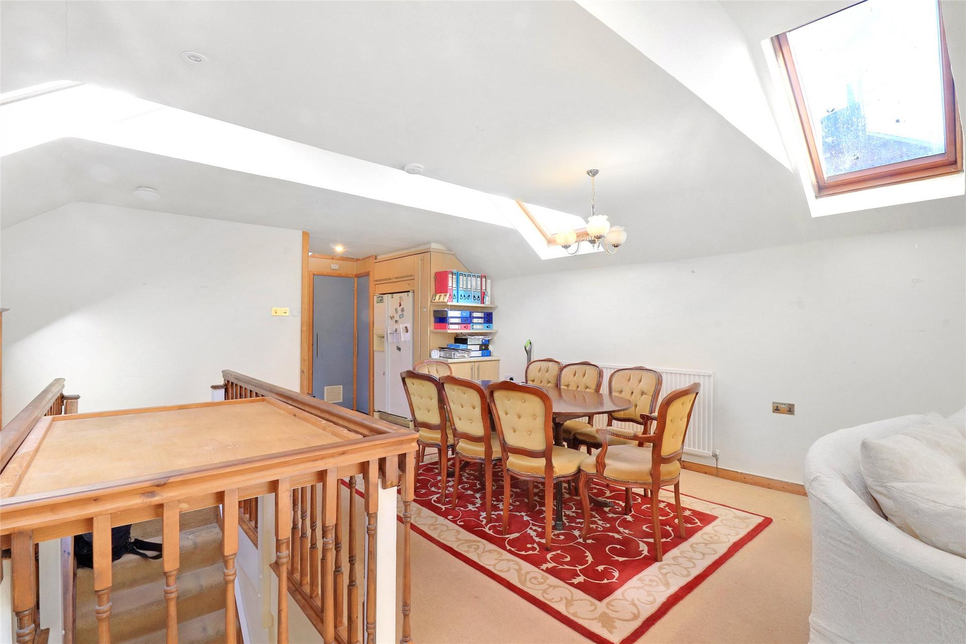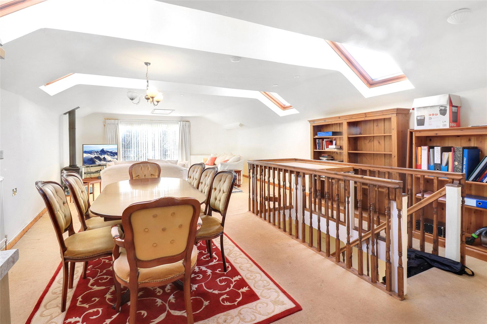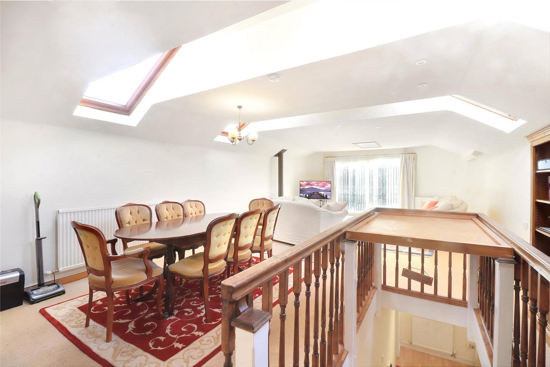 At first floor level, there is a large open plan living/dining room with high ceiling and sky lights and Juliet balcony.