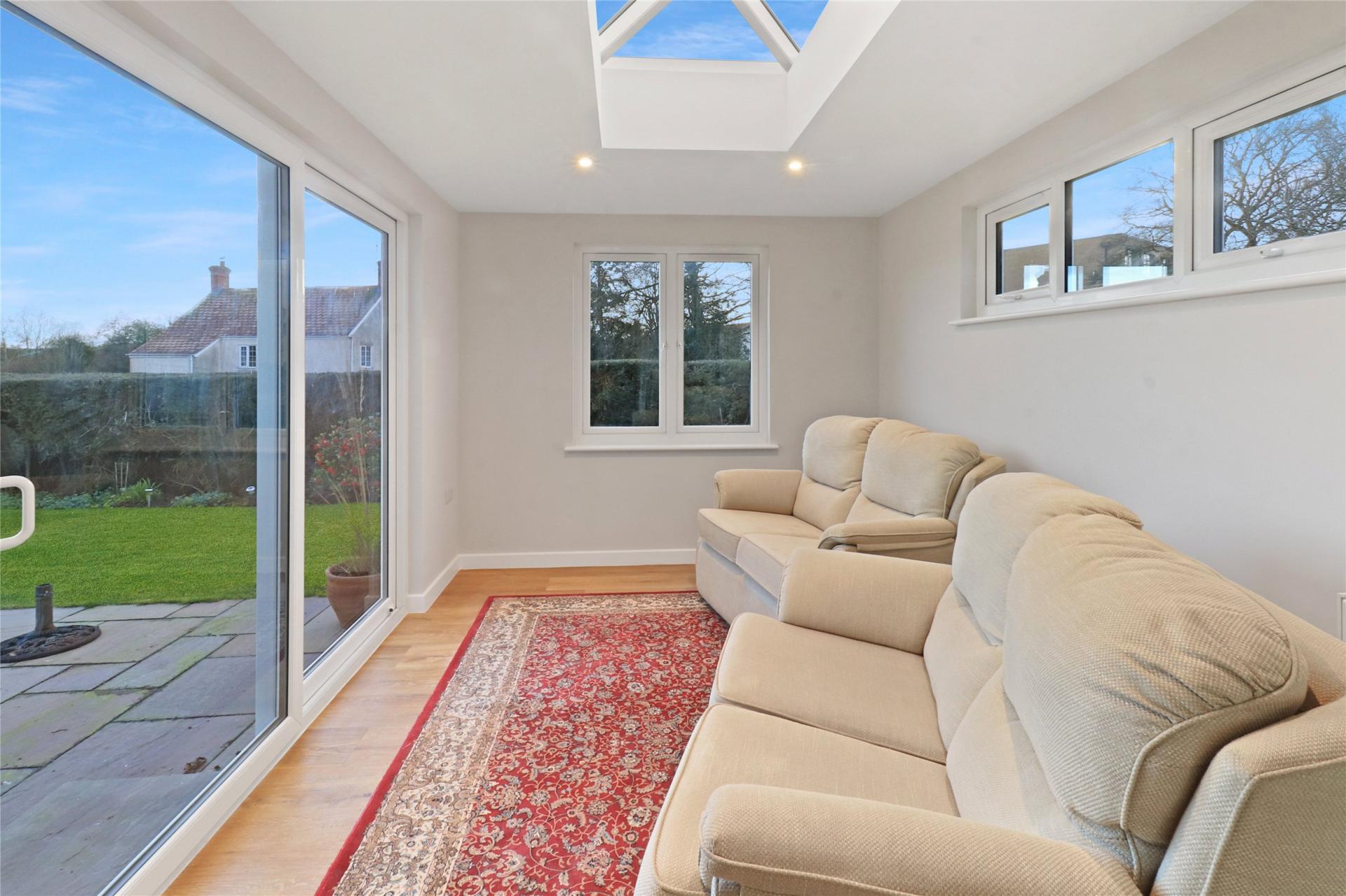 From a wide entrance hallway with access front and rear, there is a door to a superb living room with log burner. An open plan design leads to the dining area immediately adjacent to the well equipped re-fitted kitchen. From here there is access to the superb garden room overlooking the terrace and lawn.