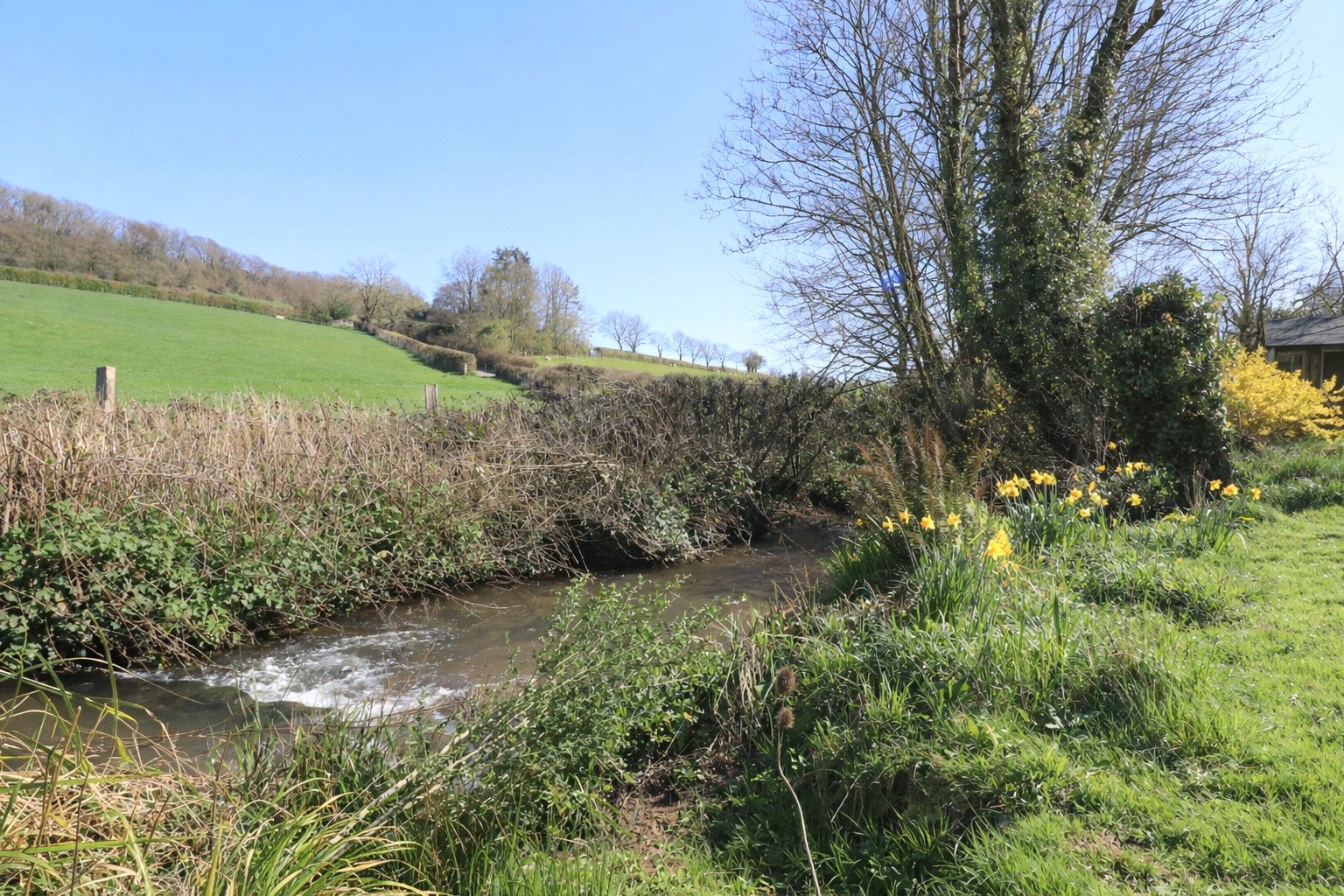 The garden is south and east facing mainly level but gently sloping towards the stream. The property has never experienced any flooding. There is a south facing terrace adjacent to the property and the garden is well stocked with mature shrubs, bushes and plants. There is a large stone outbuilding and greenhouse and a walled vegetable garden. There is a gated drive with off street parking for several vehicles, trailers or caravans. There is also a summerhouse by the stream, a shed and woodstore and the gardens wrap around three sides.