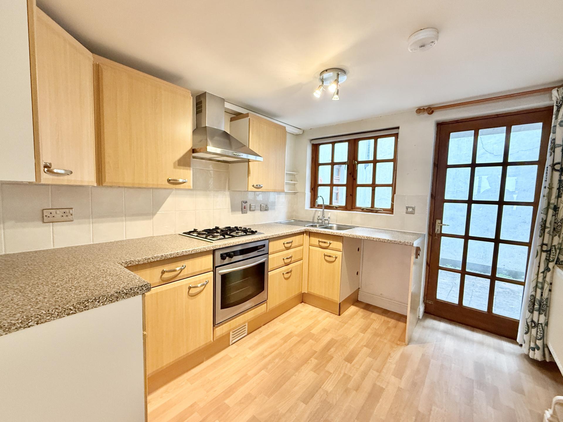 Fitted with a range of base units and drawers under square edge work surface, matching wall cupboards and tiled surrounds, inset four ring gas hob with cooker hood over and electric oven and grill under, stainless steel sink unit with one and a half bowls and mixer tap, space for fridge/freezer and plumbing for washing machine, staircase to first floor, wooden double glazed window to rear, double glazed multi paned door to courtyard, radiator.