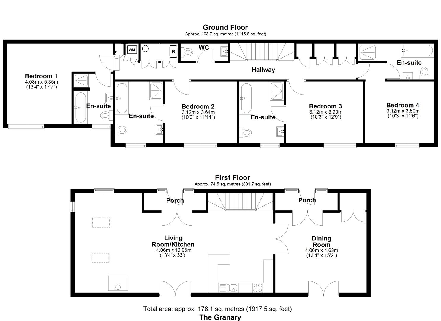 Granary Barn - Granary Barn is an imposing and most appealing traditional barn conversion providing luxury 4* holiday accommodation. The upper ground floor offers light, bright and spacious space with vaulted ceilings and exposed 'A' frames and solid wood flooring throughout. The Kitchen / Sitting Room; Kitchen area has a breakfast bar, seating providing ample space for 9 people. Woodburning stove, Juliette balcony to the front, door opening to the terrace. Dining Room; Door to the front to the terrace Juliette balcony at the rear enjoying views over the surrounding countryside. On the lower ground floor; Wooden floors throughout, tiled bathrooms, 4 large double bedrooms all ensuite. This delightful barn benefits from timber frame double glazed windows and oil fired central heating.