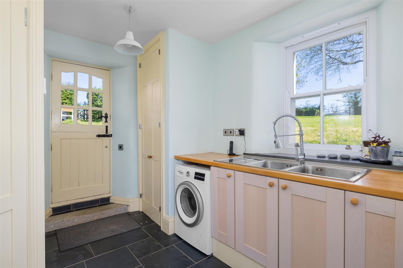 The house boasts a large entrance hall, a drawing room with wood burning stove and a fine dining room with large inglenook fireplace housing a wood burning stove. A particular feature of the house is the garden room which is triple aspect and enjoys views over the surrounding farmland to the rolling hills of Cornwall. The light and spacious kitchen / breakfast room has fitted wall and base units and granite worksurfaces, built-in induction hob and an oil fired five oven Heritage range cooker. Separate utility and pantry.