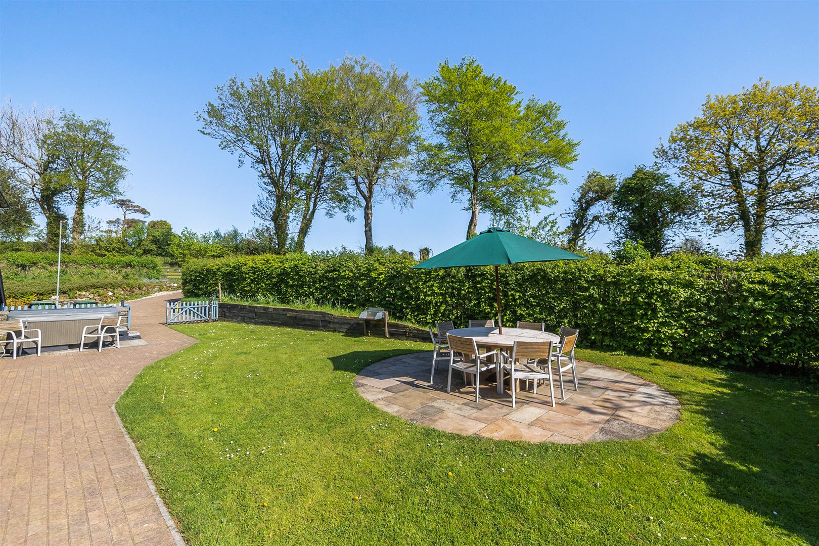 Outside - At the front of the granary barn is an enclosed and private terrace with brick paved path and seating area leading onto the lawn and a paved circular patio ideal for alfresco dining and entertaining whilst enjoying the all day sun. 6 person jacuzzi hot tub.