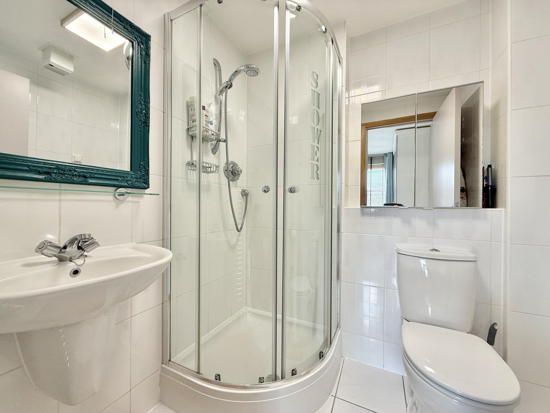 White suite comprising corner shower enclosure with mains shower and glazed doors, low flush w.c, wall mounted wash hand basin with mixer tap and shaver/light over, fully tiled walls and floor, ladder style multi fuel radiator, extractor fan, underfloor heating.