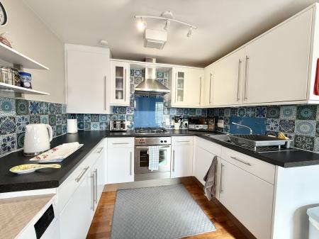 Fitted with a range of base units and drawers under roll edge work surfaces, matching wall cupboards and tiled surrounds, integrated fridge, freezer and dishwasher, inset stainless steel gas four ring hob with cooker hood over and separate electric oven and grill under, inset stainless steel sink unit with single drainer and mixer tap, extractor fan, cupboard housing gas central heating boiler, small double glazed window to side, double glazed window in the dining area overlooking the front.