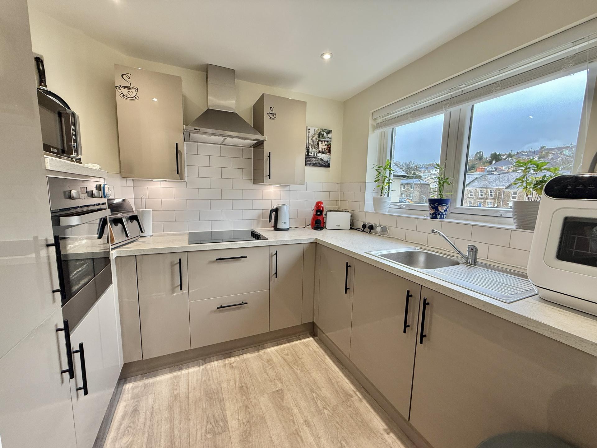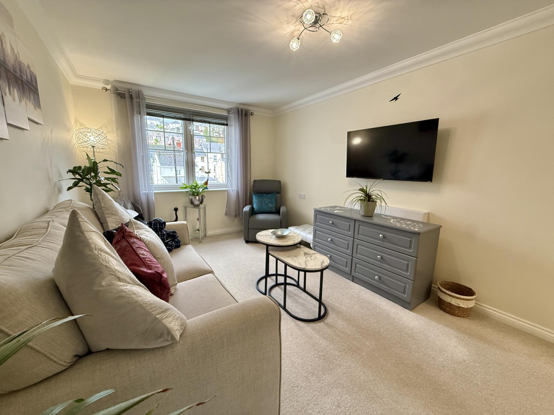 A very well presented two bedroom retirement apartment situated in Fitzford Lodge, Tavistock's newest retirement development. Located in a quiet spot at the rear of the building on the second floor, the apartment overlooks the attractive communal gardens. Fitzford Lodge is well situated, on a level walk in to Tavistock town centre with all the amenities you could need, as well as being on a main bus route. You enter the apartment to a spacious hallway, which has two handy storage cupboards and flows through to a bright living/dining room with a feature fireplace and further storage cupboard. The kitchen has a range of modern fitted units, with integrated appliances including washer/dryer, fridge/freezer and oven plus a view over the gardens. Both bedrooms are doubles and are equipped with double fitted wardrobes, they also look out from the back of the building so benefit from the peaceful aspect. Off the hallway is a spacious cloakroom and the shower room, which has a large corner shower cubicle and modern white suite.