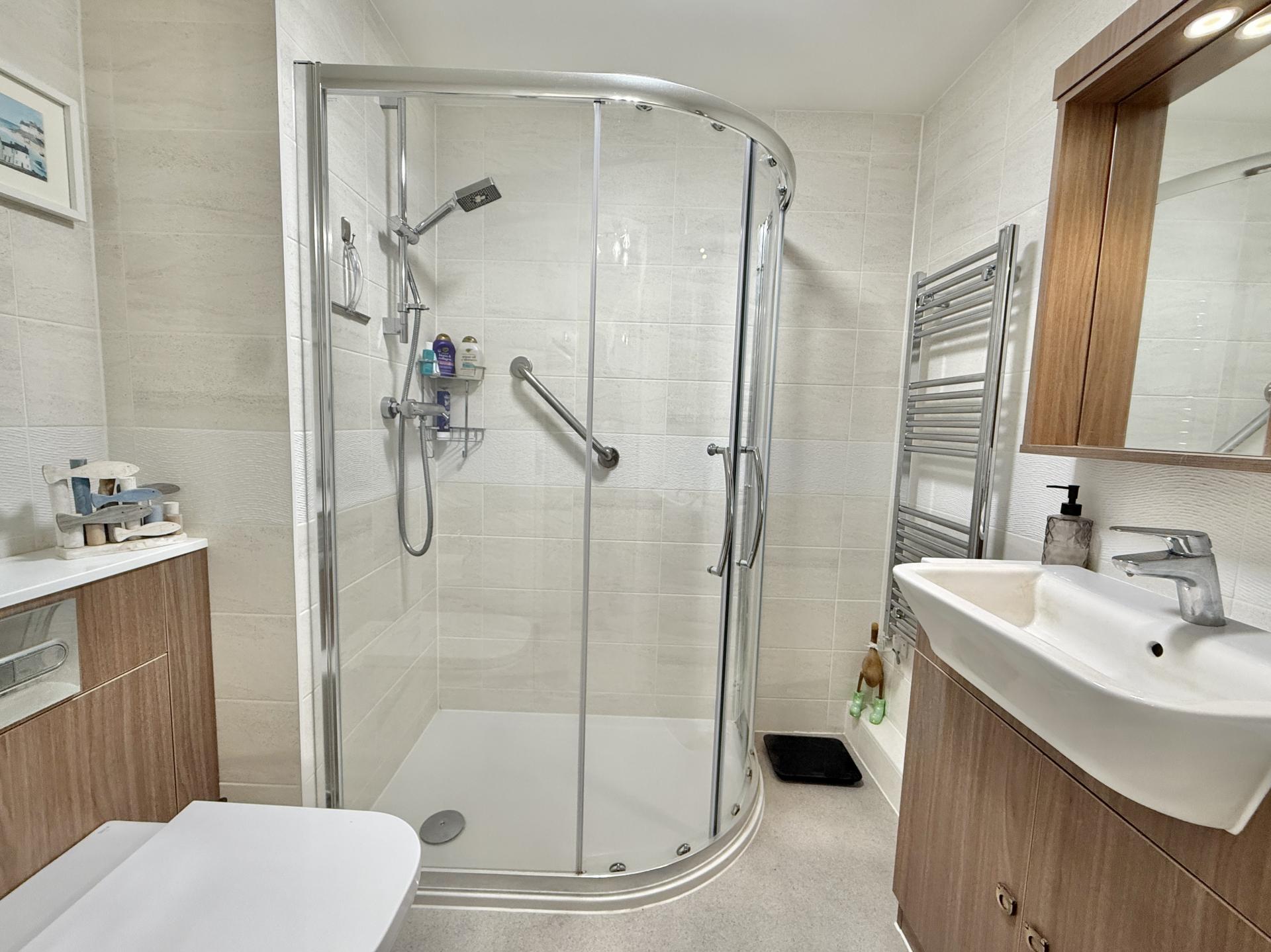 White contemporary suite comprising large tiled shower cubicle with glazed door and screen, mains shower, low flush w.c, with concealed cistern, wash hand basin with mixer tap set in vanity unit with cupboard under and further cupboard over with mirror and light, ladder style radiator, fully tiled walls, extractor fan.