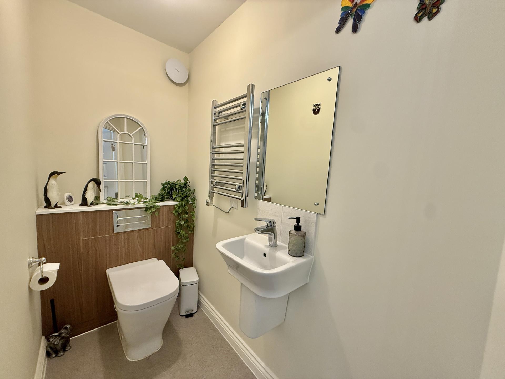 White suite comprising low flush w.c, with concealed cistern, wash hand basin with mixer tap, ladder style chrome radiator, extractor fan.