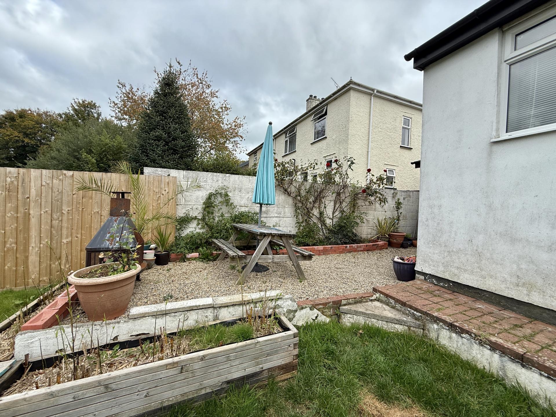 Enclosed garden to the rear with small raised deck area from garden room with steps down to brick pathway giving access to lawn with flower borders and a gravel patio to the side with border, steps up to small outhouse and door to rear of garage. Outside tap.
