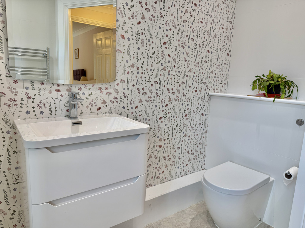Recently fitted suite comprising double walk in shower cubicle with mains powered waterfall shower, double glazed obscured window to front, wall mounted basin with vanity drawers under, low level wc with concealed cistern, fully tiled walls, chrome ladder style radiator, extractor fan, emergency pull cord, extra lighting and inset ceiling spotlights.