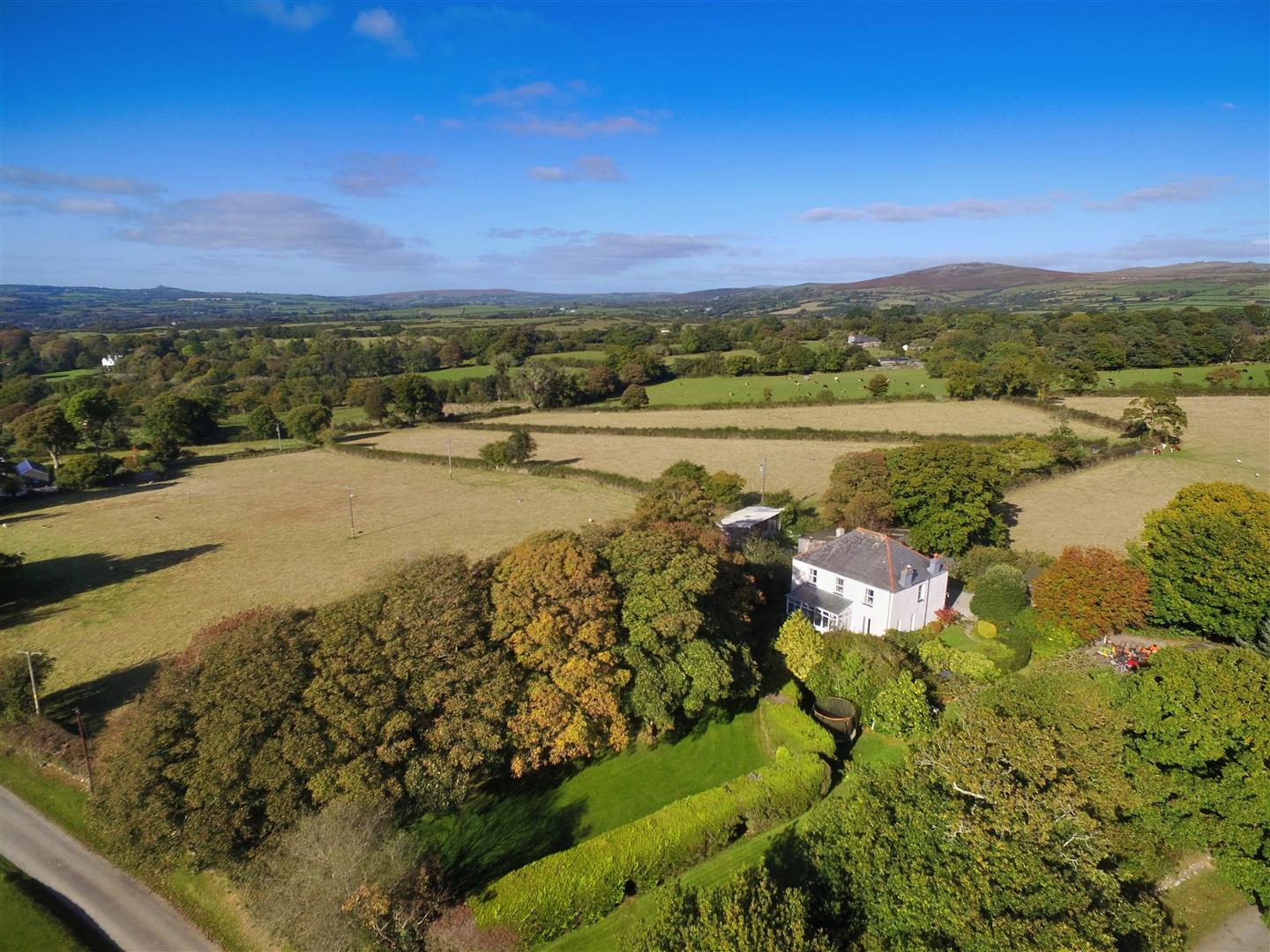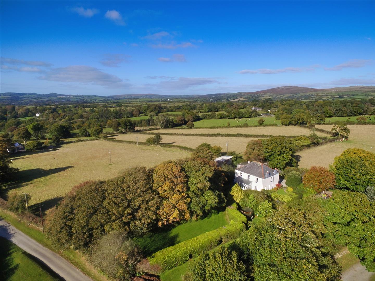 The most appealing and well-appointed accommodation benefits from uPVC double glazing throughout and briefly comprises: Rear entrance / boot room; cloakroom; tiled floor, W/C and wash handbasin, rear hall; second kitchen / dining room; fitted wall and base units, stainless steel sink and draining board, electric cooker, oil fired Rayburn, space for washing machine and dishwasher and built in cupboard. Primary kitchen / dining room; a dual aspect room with windows to the rear and side with far reaching panoramic views over the land and surrounding countryside and Brentor church, fitted wall and base units, LPG gas hob with extractor hood, space for washing machine, tumble dryer and dishwasher, tiled floor, oil fired Rayburn and built in Zanussi electric oven. Entrance porch / boot room; door to the rear garden. Sitting room; a dual aspect room windows either side of a fireplace overlooking the garden and French doors open onto the patio and front garden open fireplace with wood burner effect oil fired stove. Drawing room; ornate open fireplace, picture and dado rails, windows to the side overlooking the land with far reaching views and French doors into the sun room. Sun room; a triple aspect room with views over the garden, land and surrounding countryside. On the first floor; large full width dual aspect landing, 5 generously sized double bedrooms and a family bathroom with vanity wash handbasin, W/C, bath, separate shower cubical and built in airing cupboards.
