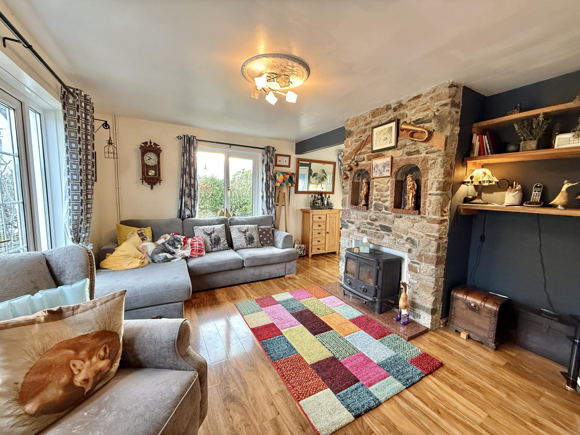 A detached three bedroom home in the moorland village of Mary Tavy, just outside of Tavistock. This spacious home has scope for extending as it is set on a generous corner plot on a small cul-de-sac of properties. You enter to a useful porch with plenty of space for coats and shoes. The ground floor consists of a wraparound sitting/dining room with a log burner separating the two spaces and two sets of French doors onto the garden. The log burner is set in front of an attractive exposed stone chimney breast, making a nice feature for the room. There is a kitchen with exposed beams and granite worktops plus a good size utility room leading out to a downstairs WC and the single garage.