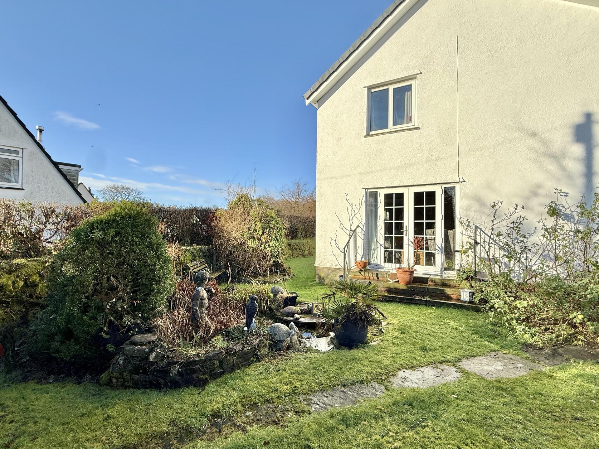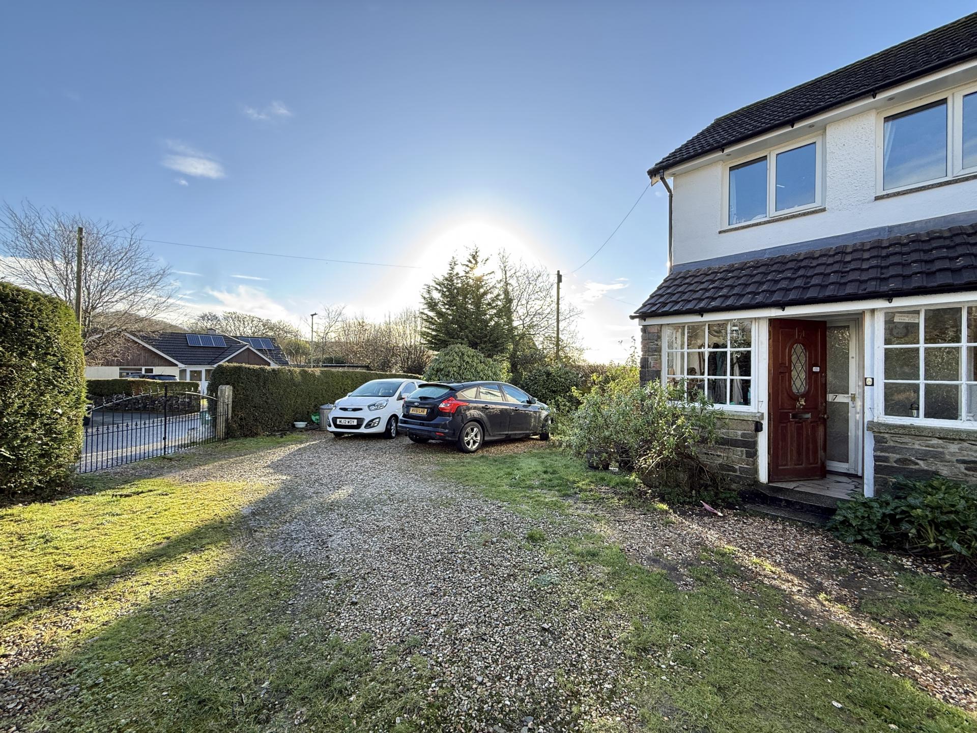 The property occupies a corner plot with wraparound gardens mainly laid to lawn to the sides and rear with natural Devon bank boundaries, summerhouse, garden shed. Large parking area for several cars and room for a caravan/motorhome, wrought iron gates to the road.
