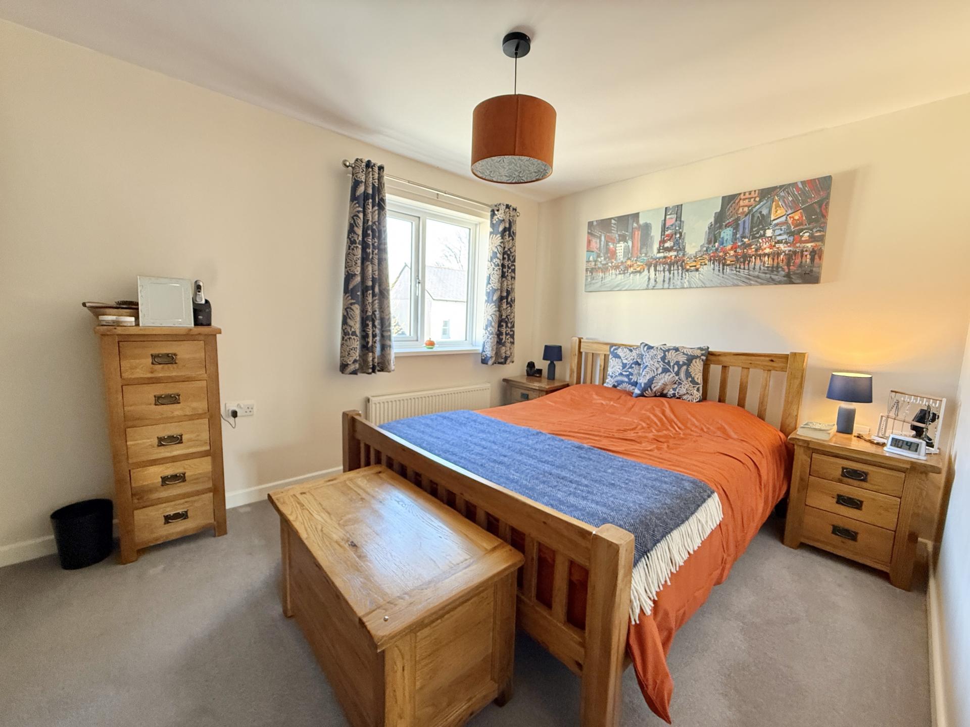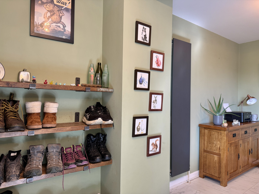 Upstairs the main bedroom is a good size and benefits from open fronted wardrobes made from reclaimed wood as well as additional storage in the airing cupboard. Across the landing are two large single bedrooms (one with fitted cupboard) plus a fully tiled family bathroom with modern white suite. The property benefits from solar panels with battery which were fitted in 2025 and are owned.