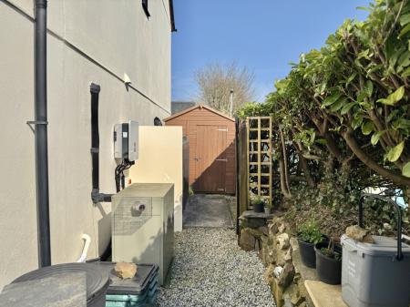 Enclosed garden with sunny aspect, mostly paved with gravelled borders, outside tap and light, wooden shed, oil tank, floor mounted oil boiler and battery for solar panels, gate leading to two parking spaces. To the front there is small front garden which is gravelled with mature shrubs.