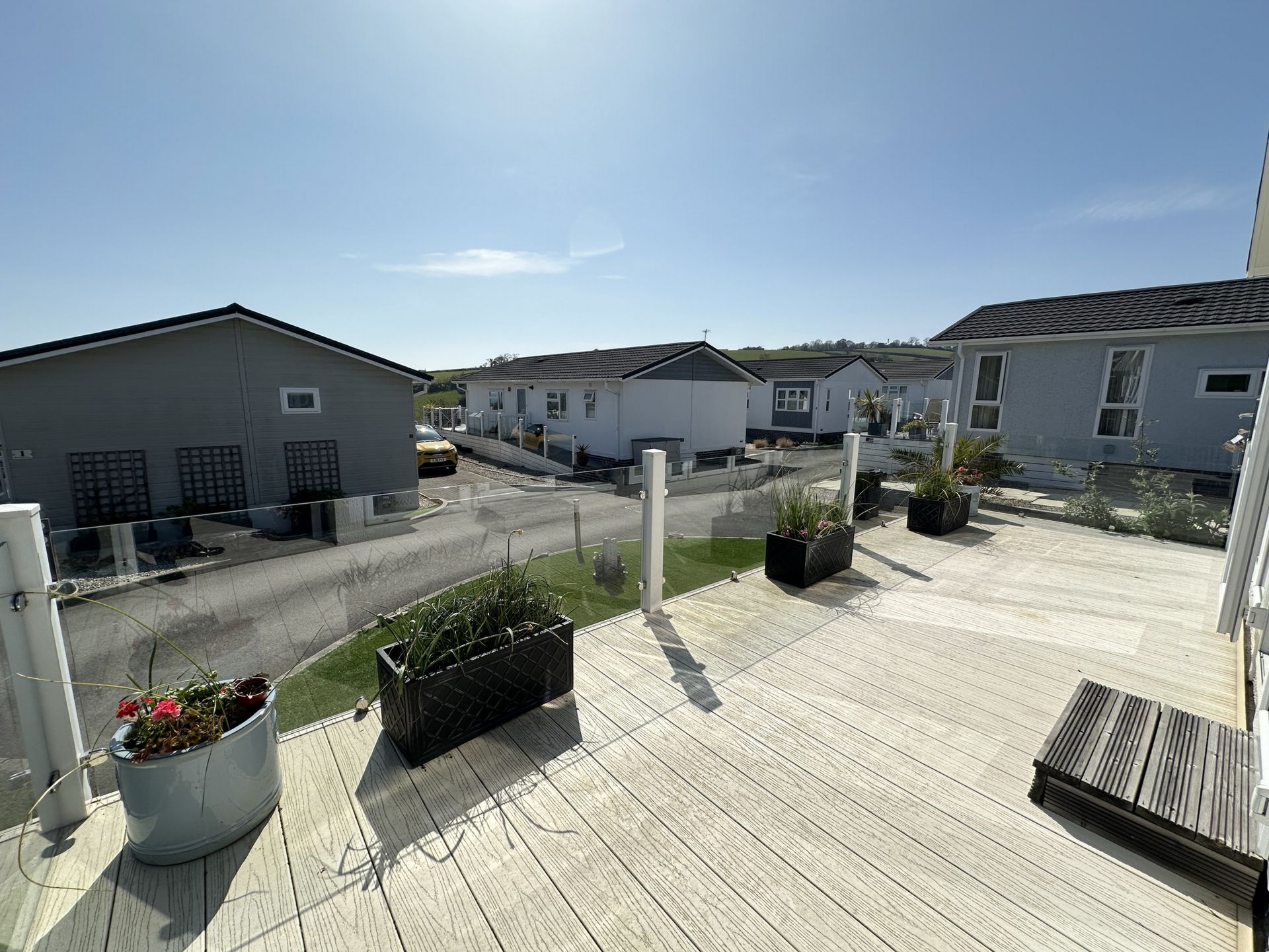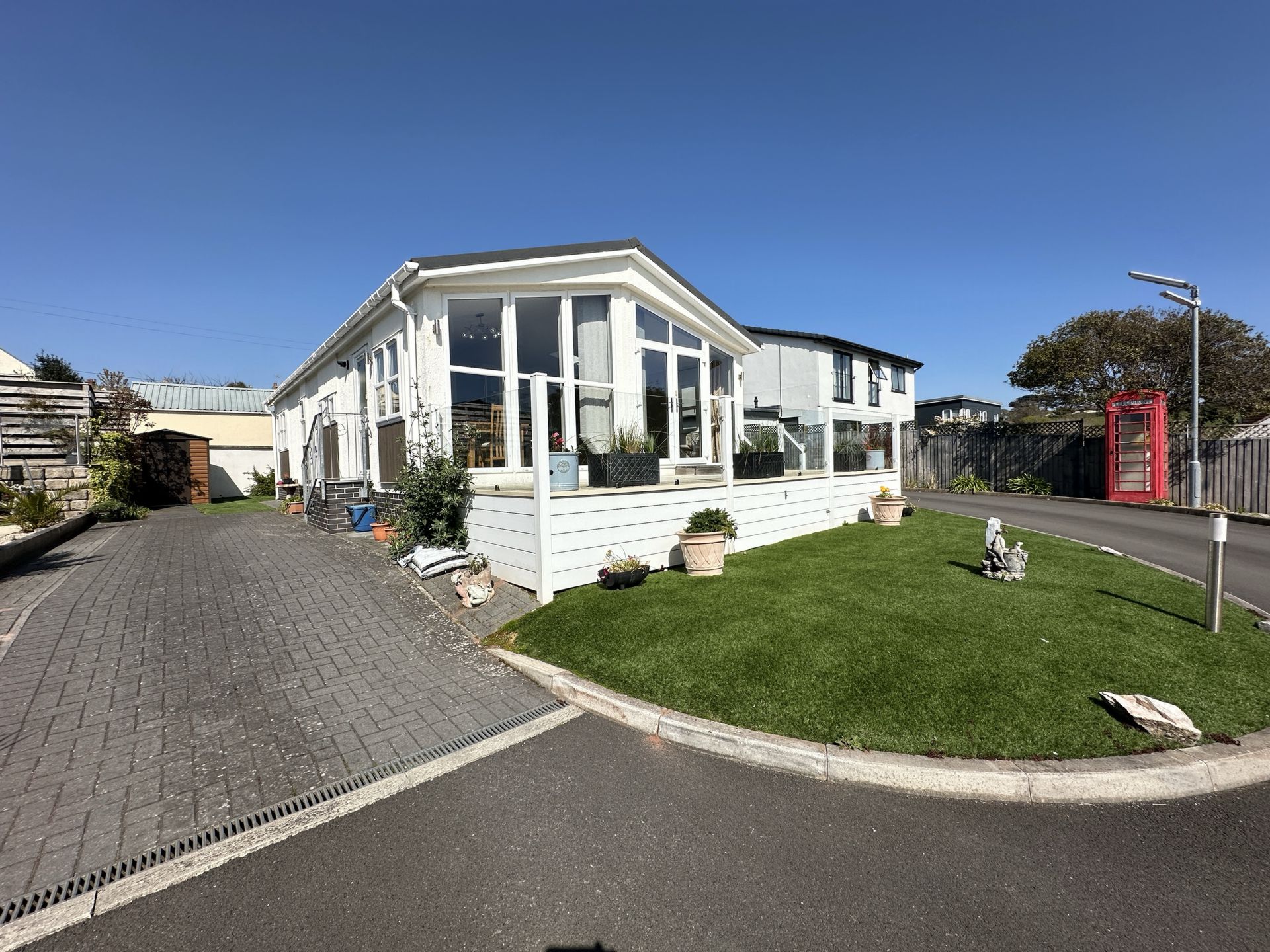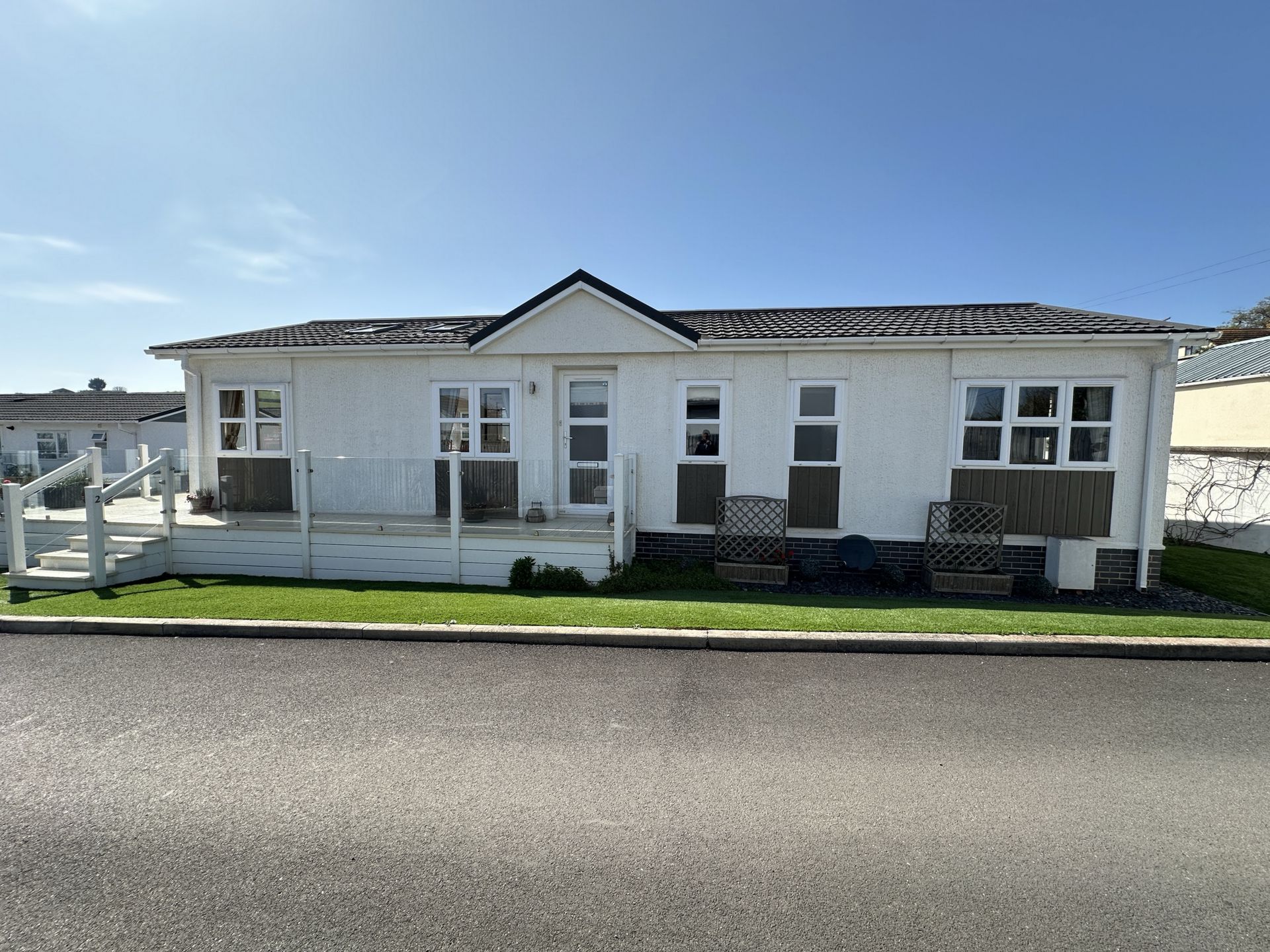 OUTSIDE: The plot is laid with artificial lawn for ease of maintenance with steps up to the main entrance and south facing sun deck. There is a tandem parking area, two storage sheds, outside water tap and power socket to the opposite side with another door to the dining area.