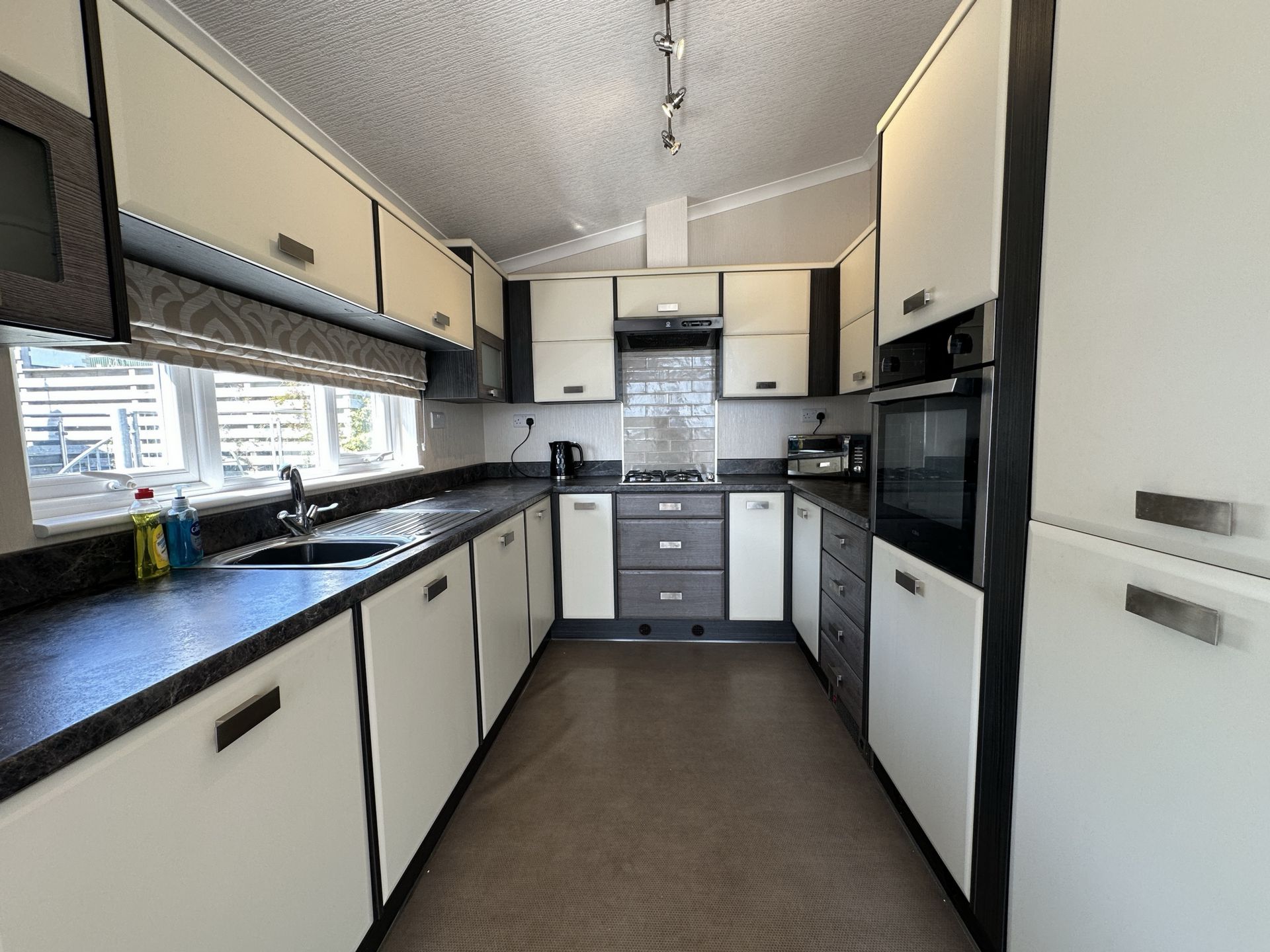 KITCHEN: 3.60m x 2.49m (11'10" x 8'2"), A contemporary fitted kitchen with contrasting eye level base units and drawers with roll top work surfaces over. Inset stainless steel sink and drainer with mixer tap, integrated appliances including gas hob with extractor over, eye level oven, fridge/freezer, dishwasher and washing machine. uPVC double glazed window to the side aspect and spotlights.