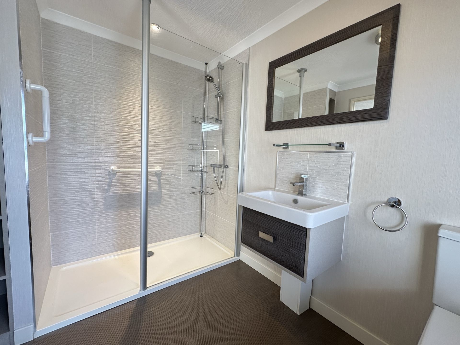 EN SUITE SHOWER ROOM: A spacious en suite shower room comprising walk in double enclosure, tiled surround, with thermostatic shower over and glass screen, close coupled WC, wash hand basin with mixer tap and vanity storage under. Radiator, built in storage, extractor and uPVC obscure double glazed window to the side aspect.