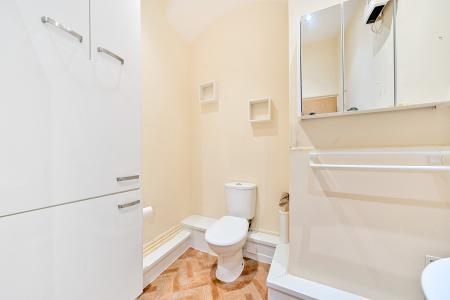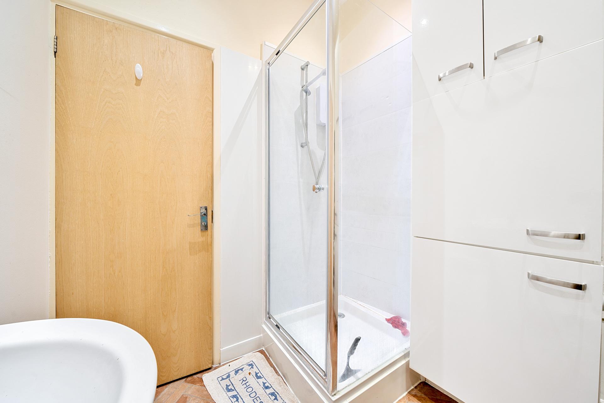 The bedroom is a double room with a large double glazed window, and the shower room has a modern white suite that includes a shower cubicle and electric shower, a low level WC, and a pedestal wash basin.