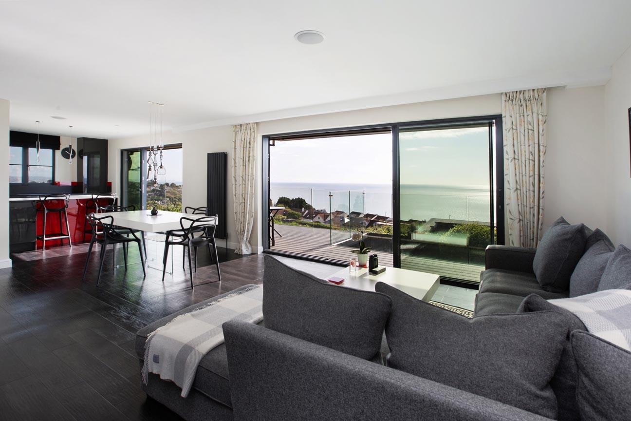 L SHAPED SITTING/DINING ROOM: A wonderful L Shaped room with large sliding doors leading to the balcony/terrace. Stunning panoramic views out to sea, feature modern Jotul gas stove, wall light point, panelling to one wall, feature radiator, space for 2 seating areas and a table and chairs open to: