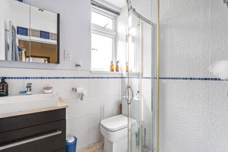 Upstairs, there are three bedrooms, two excellent doubles, one with a wardrobe built into the recess on one side of the chimney breast and a bay window, and a single, currently used as a study, ideal for those working from home. A family shower room contains a shower, a basin, and a WC, and the landing has a hatch in the ceiling with a fold down ladder providing access to the spacious and fully insulated and boarded loft space, with a light for convenience. The loft has excellent potential for conversion into additional accommodation if required.