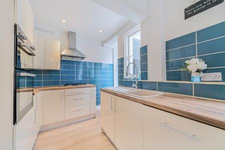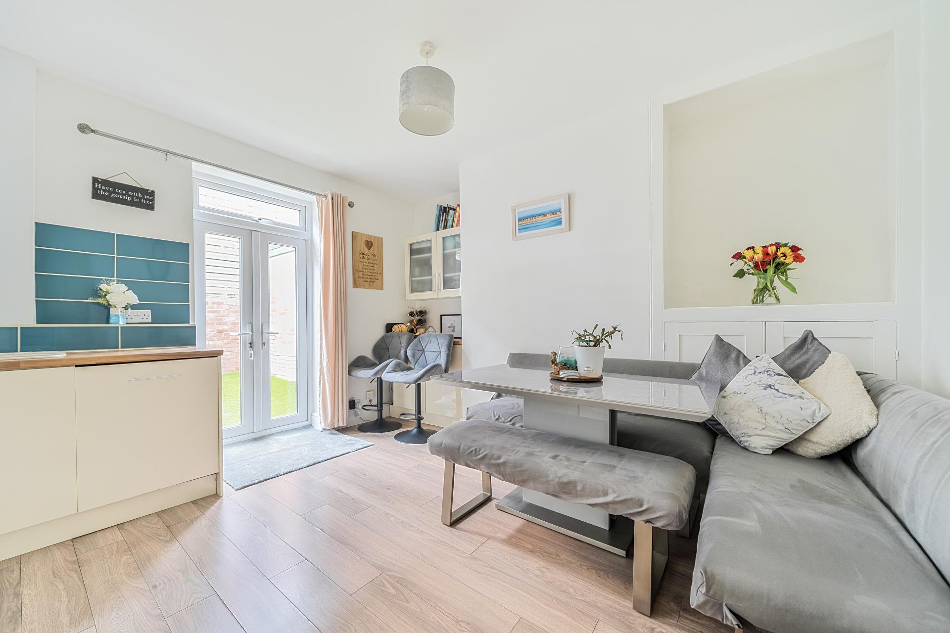 - Modern open-plan kitchen/diner with French doors.