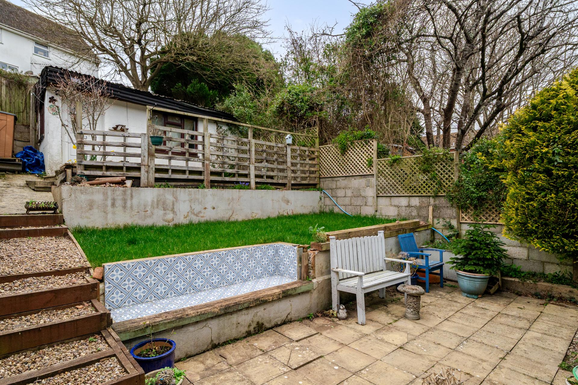 - Terraced rear garden with patio, lawn, deck, and workshop