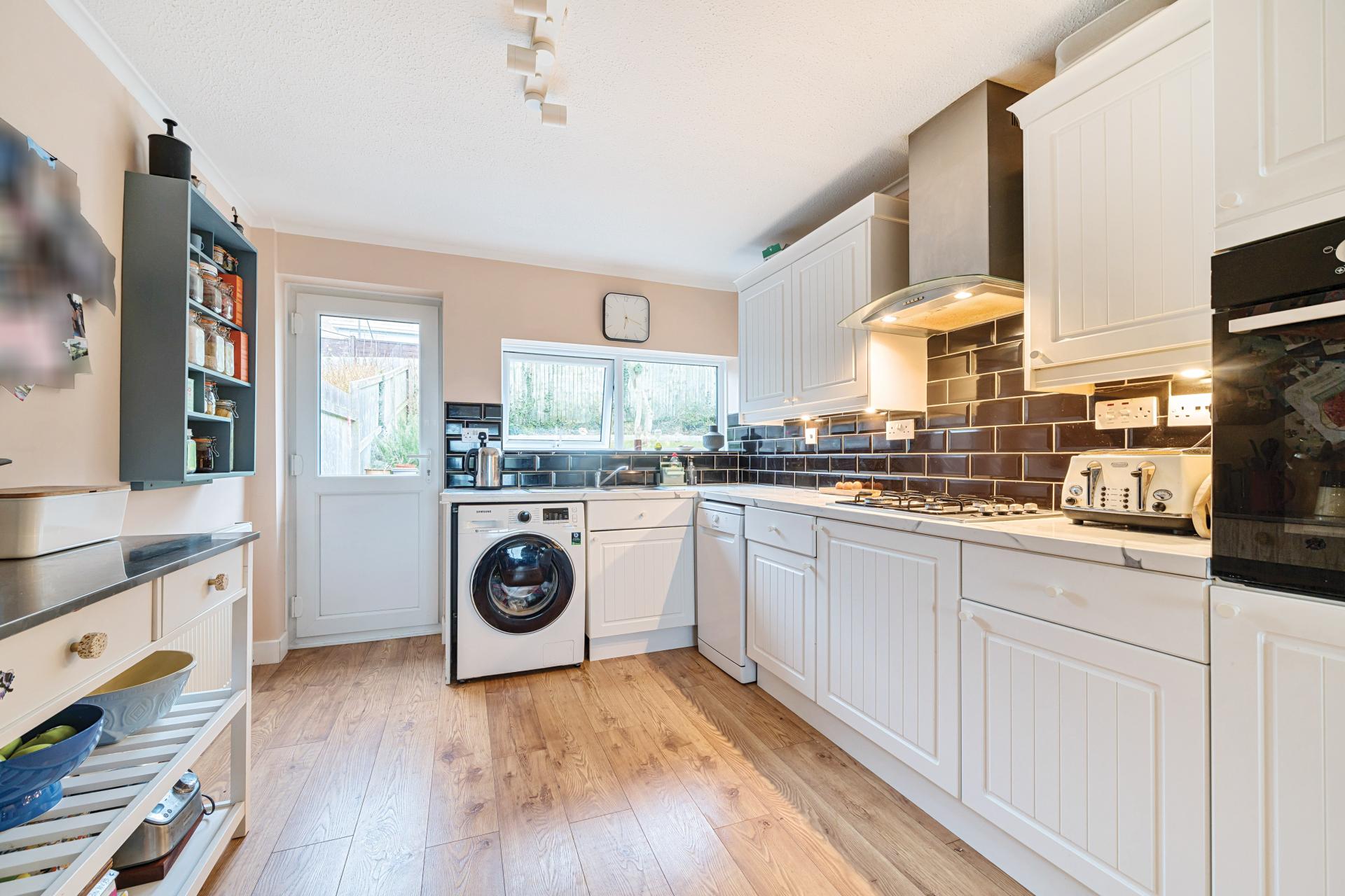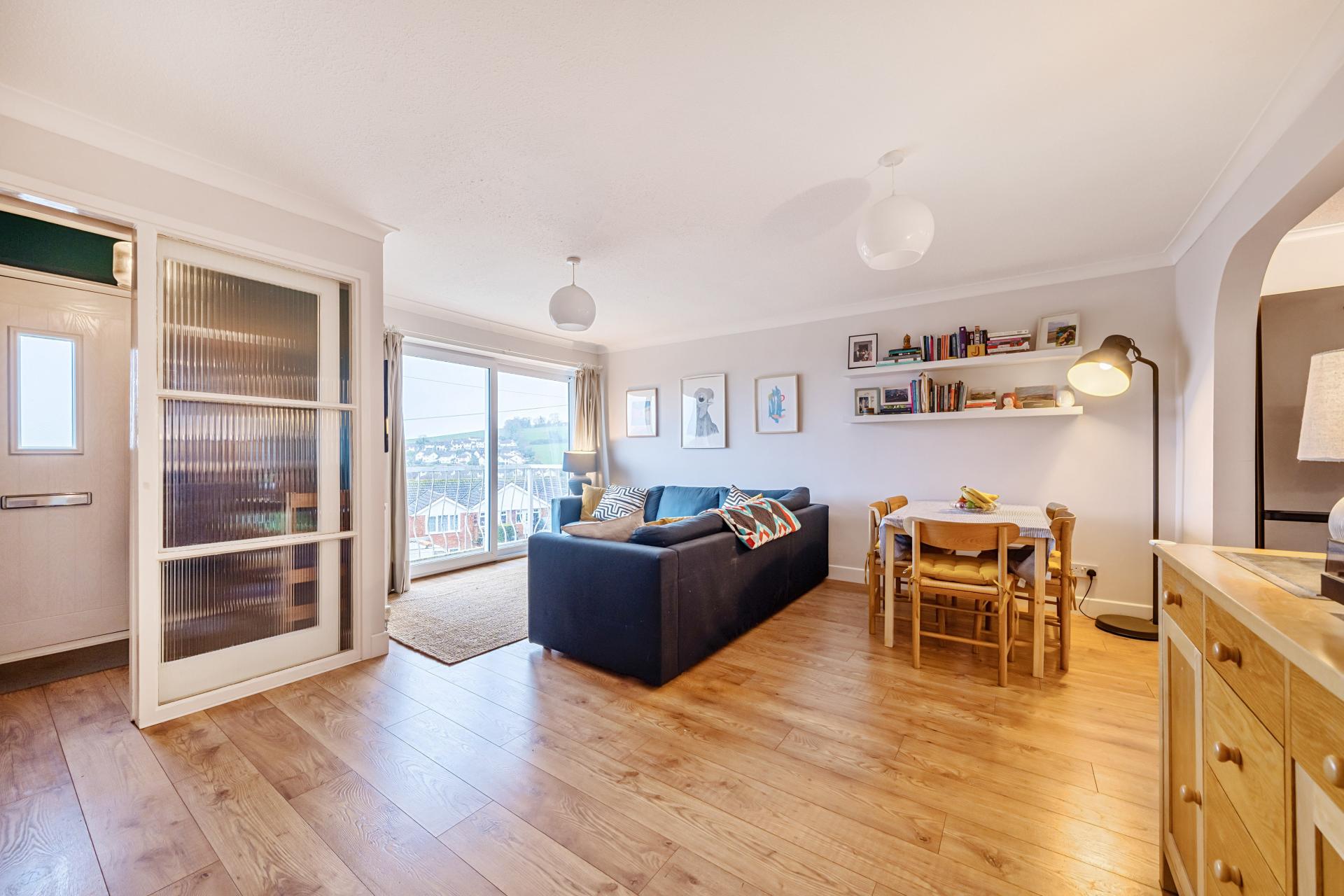 As you walk through the front door there is a small porch area perfect for shoes, coats, dog leads and anything further that needs hiding away. You then step into the lounge which is a large light and airy space. It offers patio doors onto the balcony providing views across the green hills of Teignmouth and beyond. The lounge opens up into the dining area and beyond that into the Kitchen. It is a fantastic open space that is perfect for hosting as well as those cozy family nights. The kitchen itself has ample space and a door to the rear garden. There is space for washing machine, dishwasher and fridge freezer. There is an integral oven and hob with extractor hood over. The kitchen has tiled splash-back and a range of matching wall and floor based units.